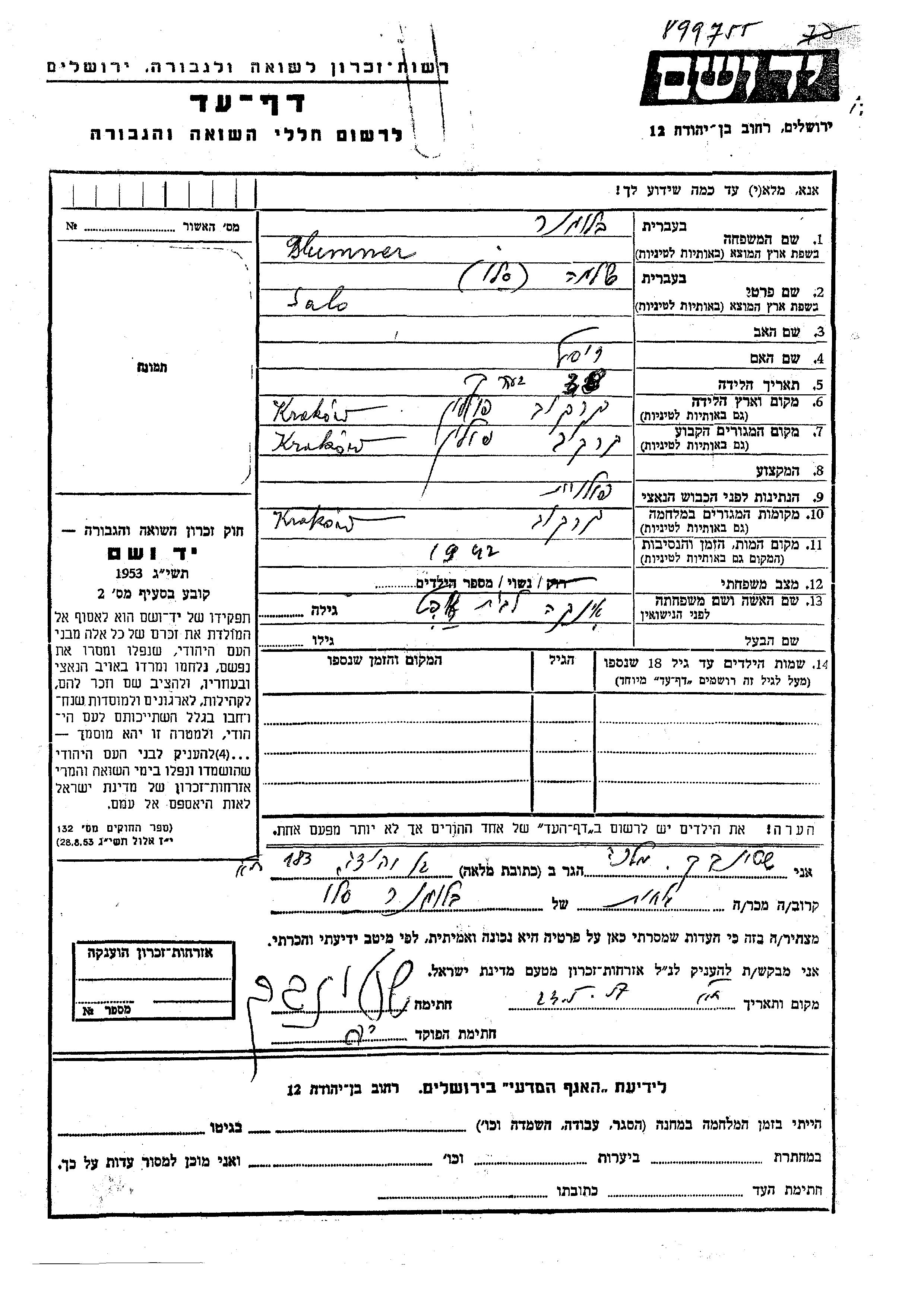 Blumner Salo Krakow, Pologne Feuille de témoignage