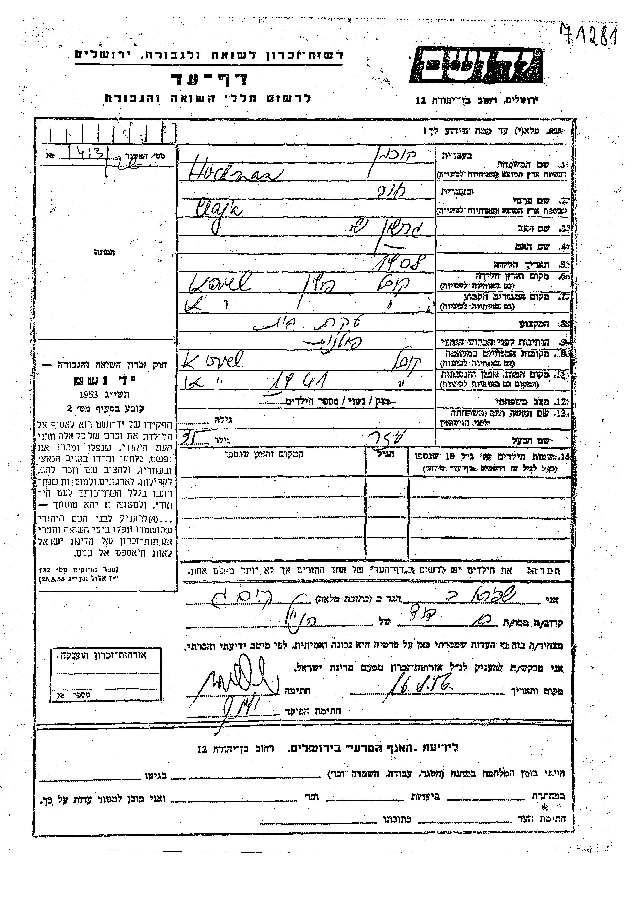 Hocher Hokhman Chaja 1908 Kowel, Pologne Feuille de témoignage