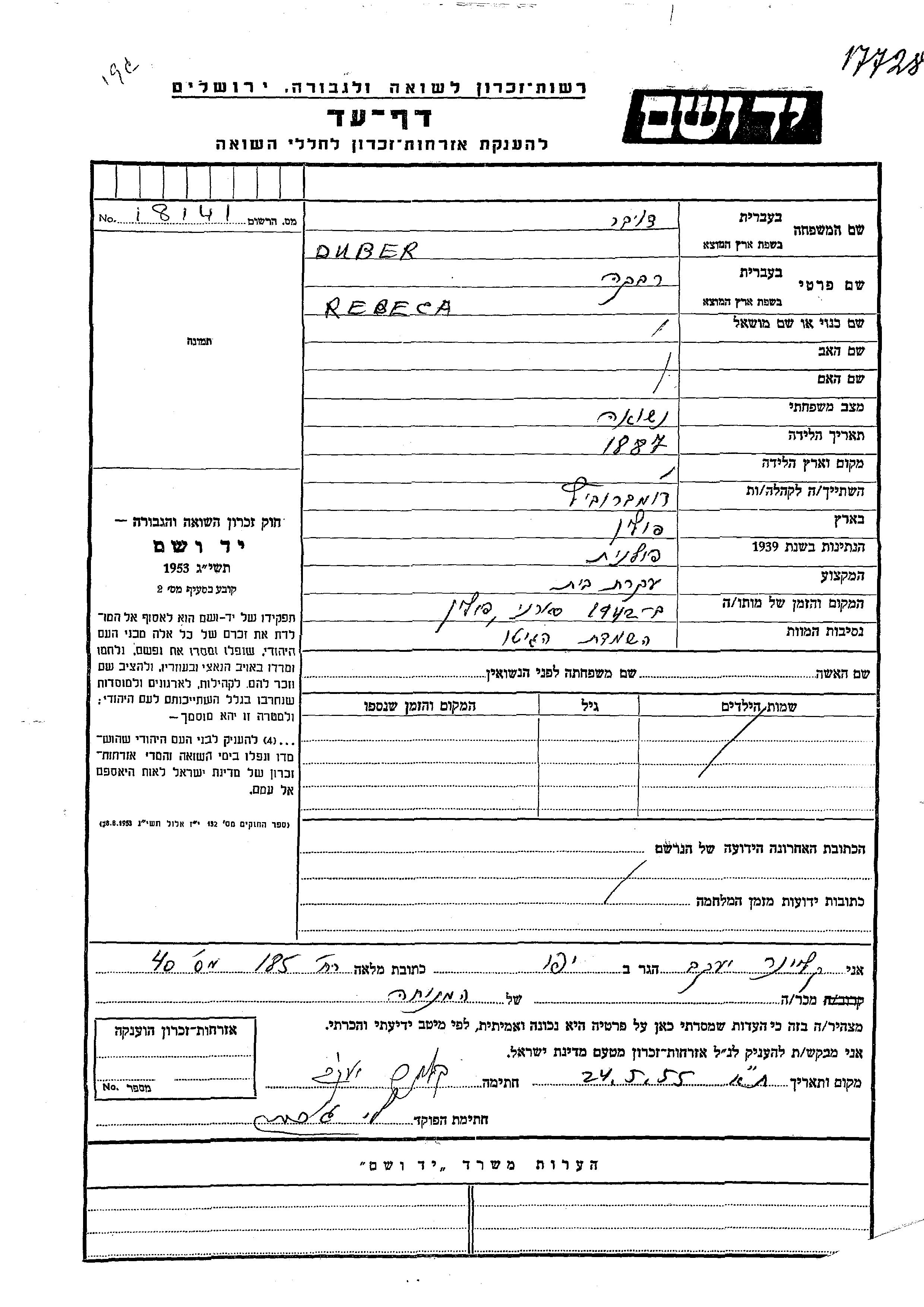 Duber Dober Rebeca 1887 Dabrowica, Pologne Feuille de témoignage