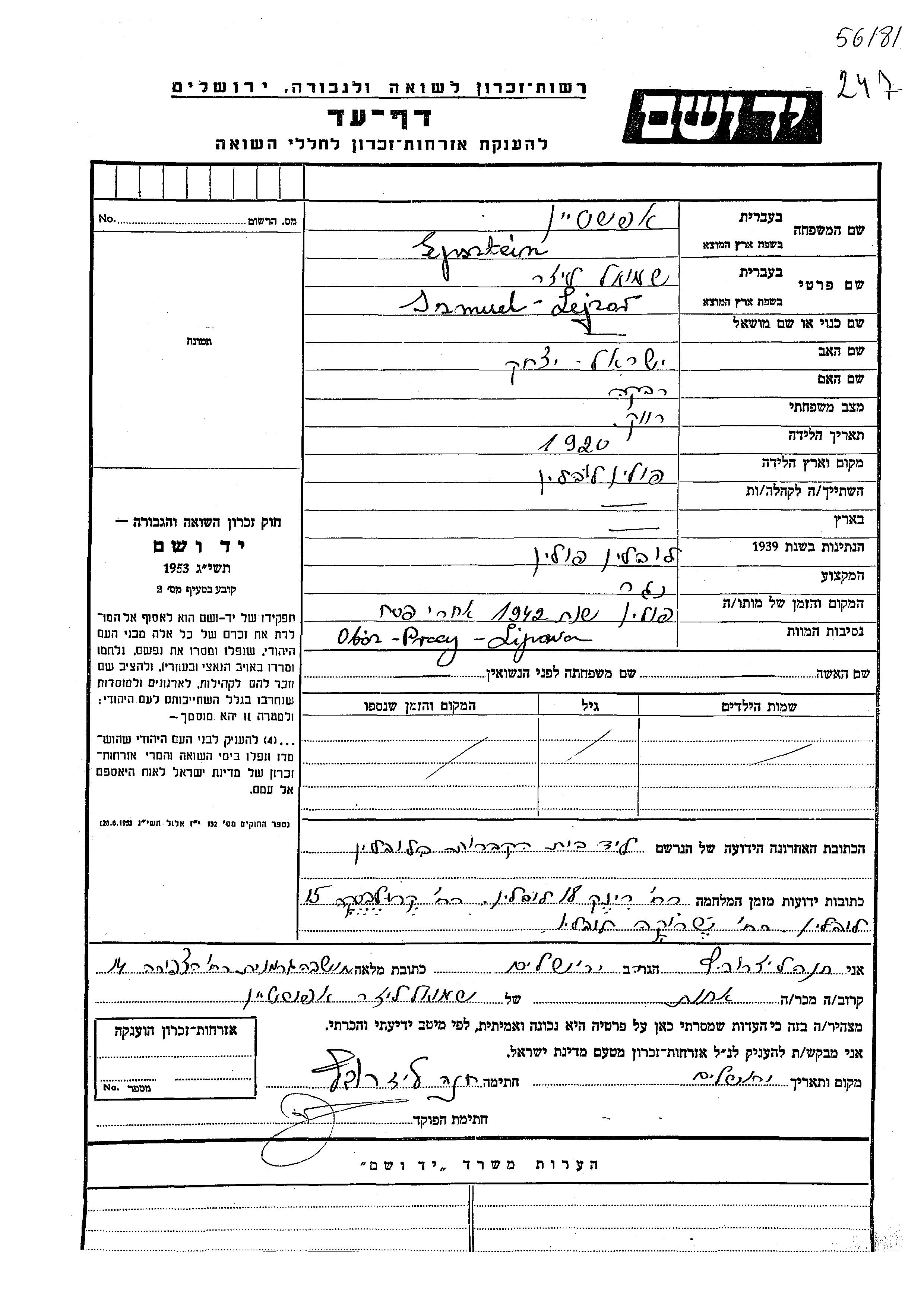 Epsztein Szmuel Lejzor 1920 Lublin, Pologne Feuille de témoignage