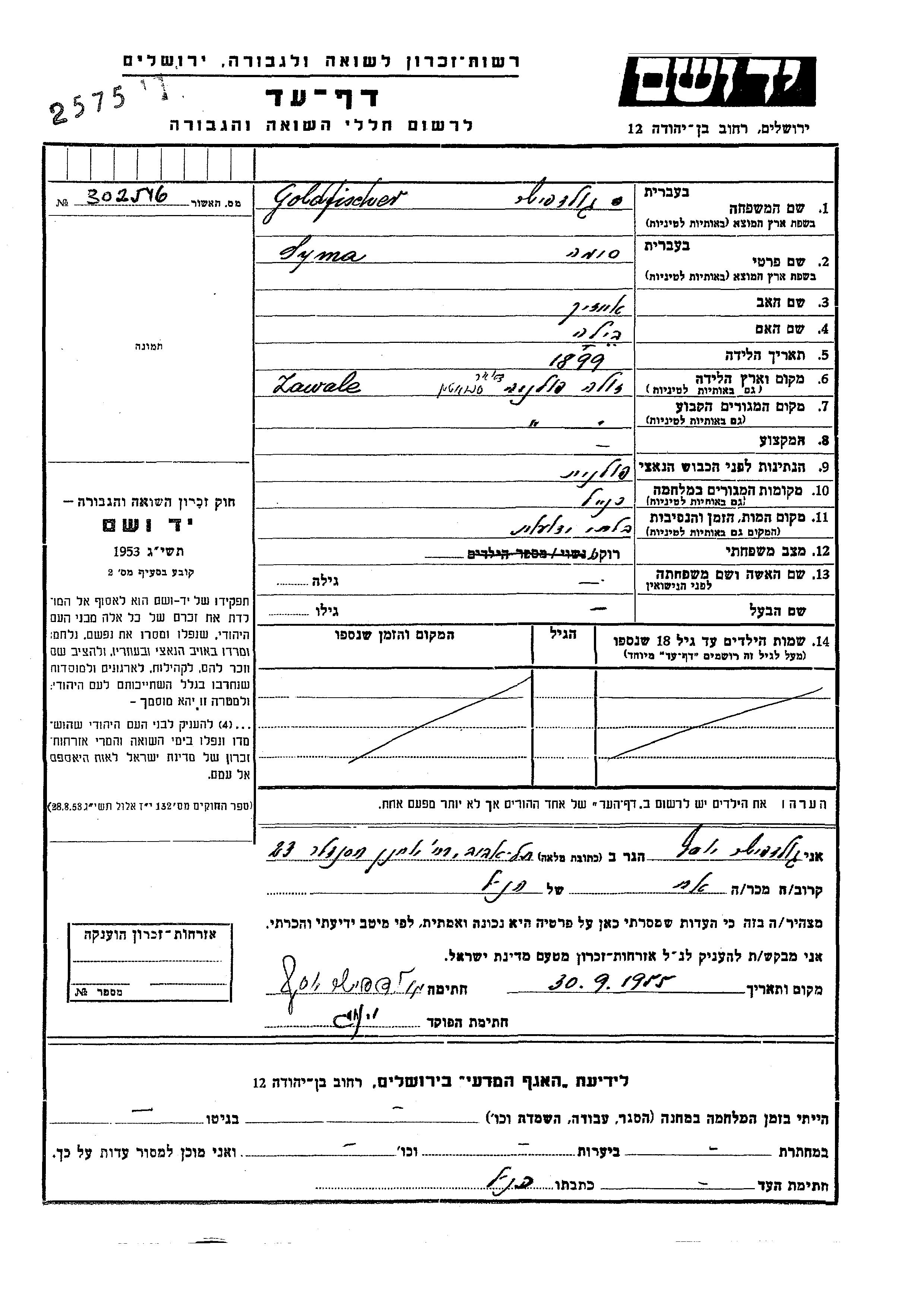 Syma Goldfischer est née à Zawale, Pologne en 1899, fille de Aizik et de Bila. Elle était Célibataire. Avant la seconde guerre mondiale elle vivait à Zawale, Pologne. Pendant la guerre, elle était à Zawale, Pologne.