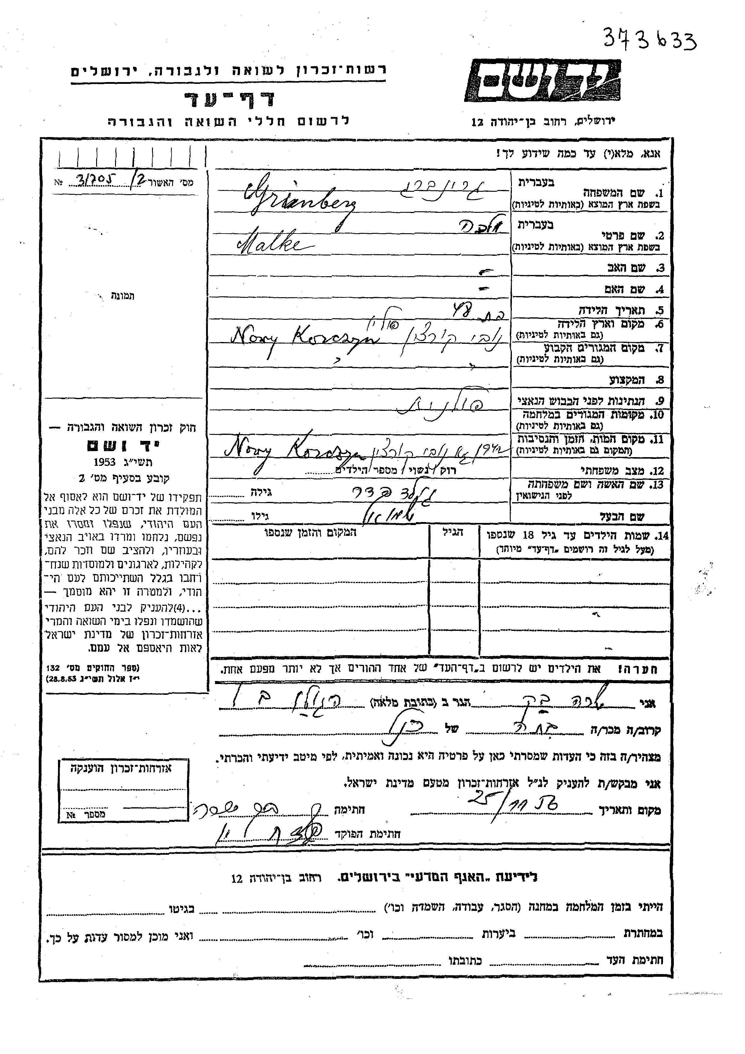 Malke Grinberg née Goldfeder est née à Nowy Korczyn, Pologne. Elle était Mariée à Shmuel. Avant la seconde guerre mondiale elle vivait à Nowy Korczyn, Pologne.