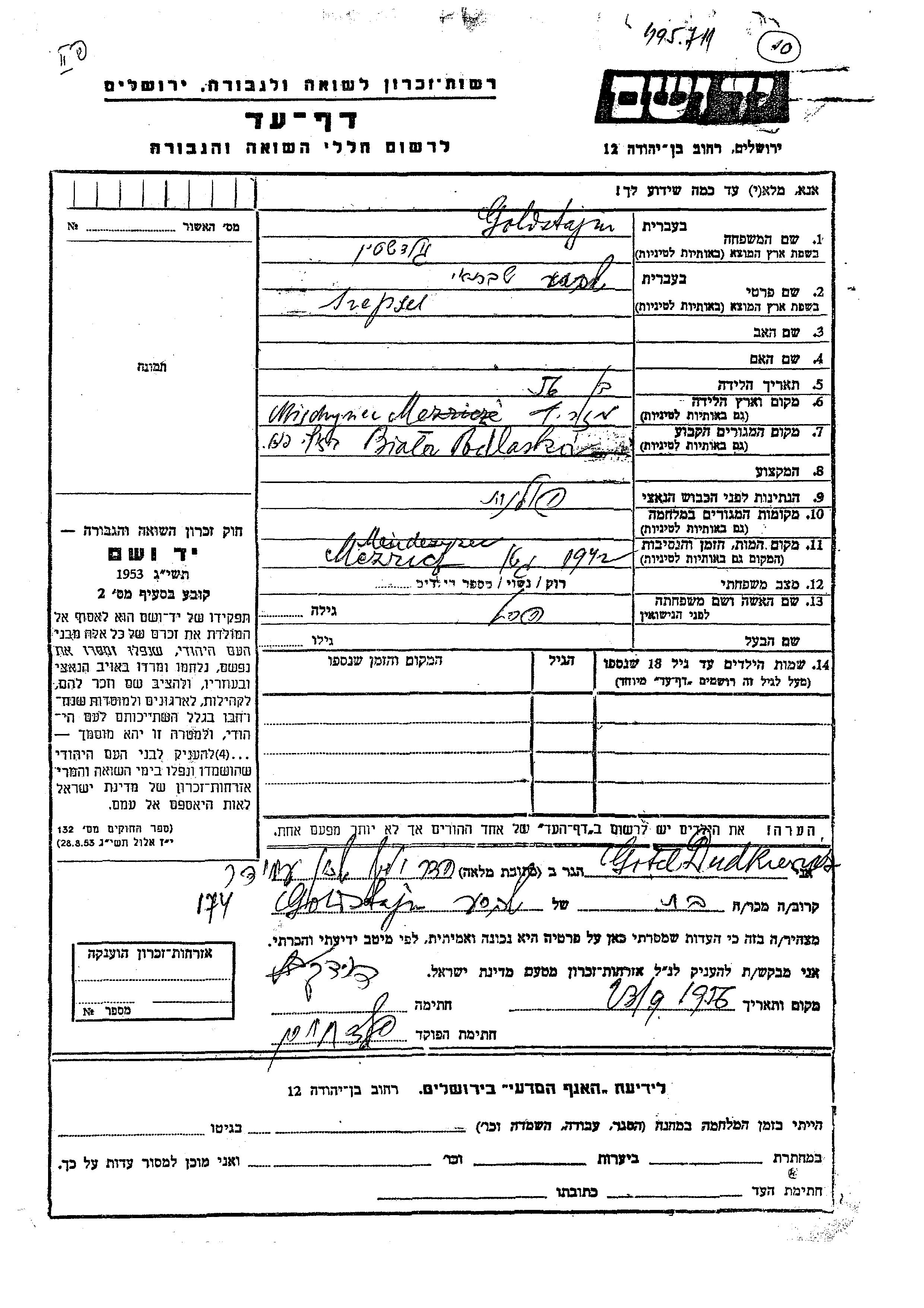 Goldsztajn Szepsel Biala Podlaska, Pologne Feuille de témoignage