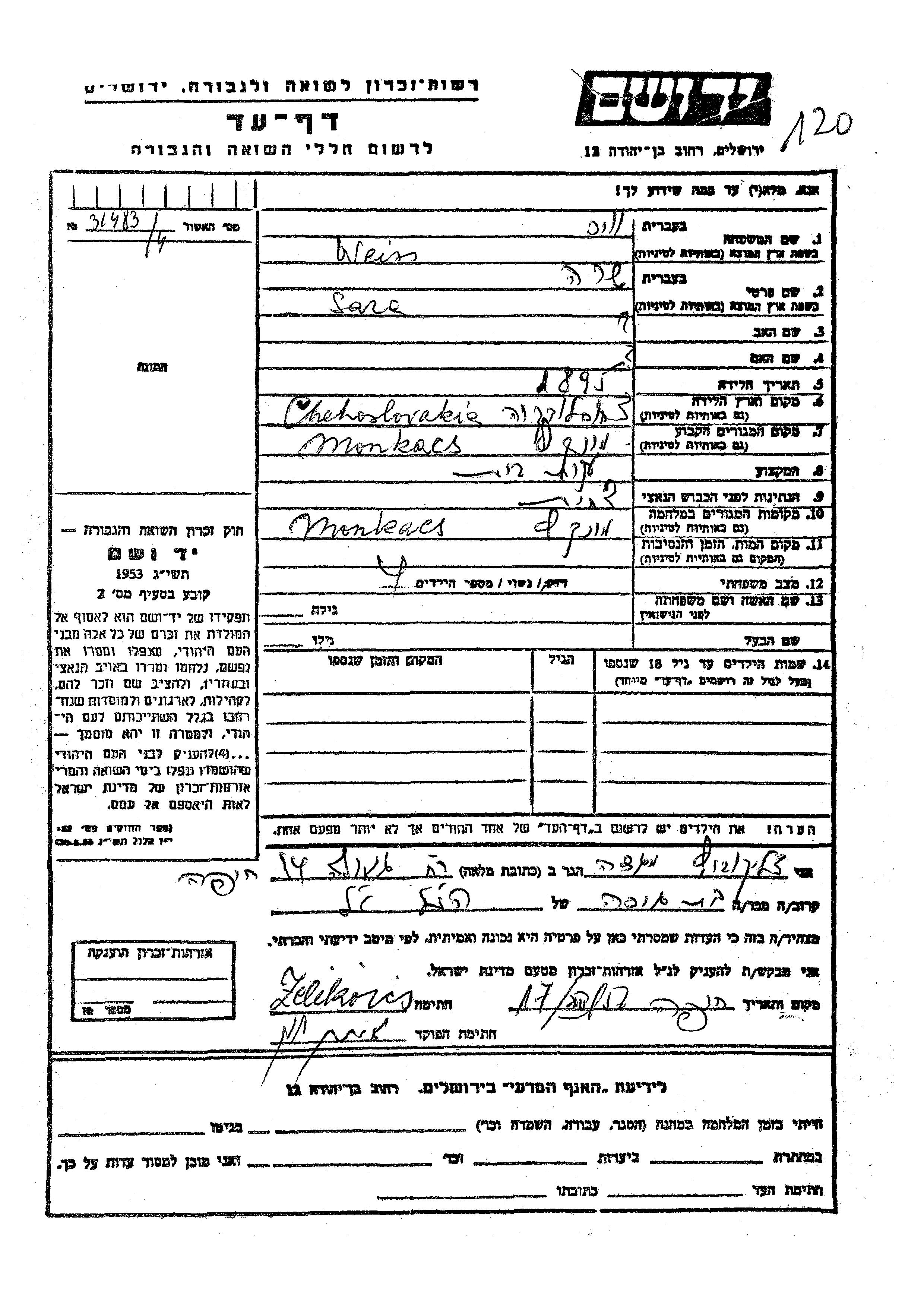 Weiss Sara 1895 Munkacs, Tchécoslovaquie Feuille de témoignage