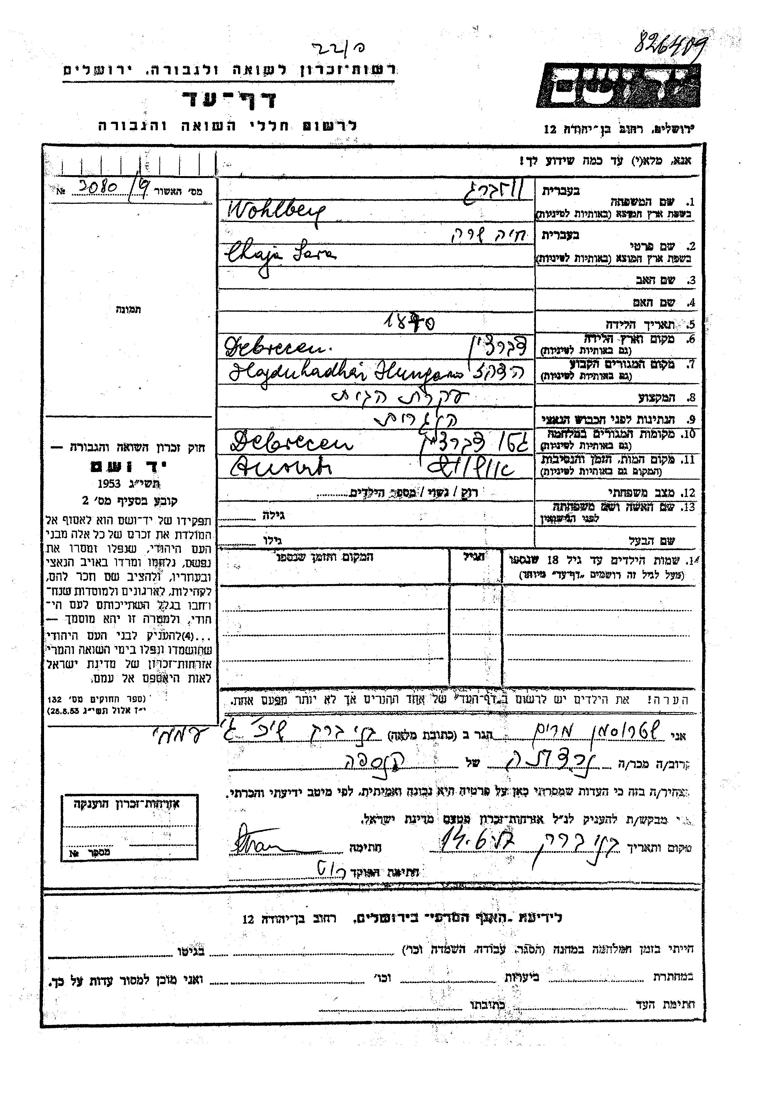 Wohlberg Chaja Sara 1870 Hajduhadhaz, Hongrie Feuille de témoignage