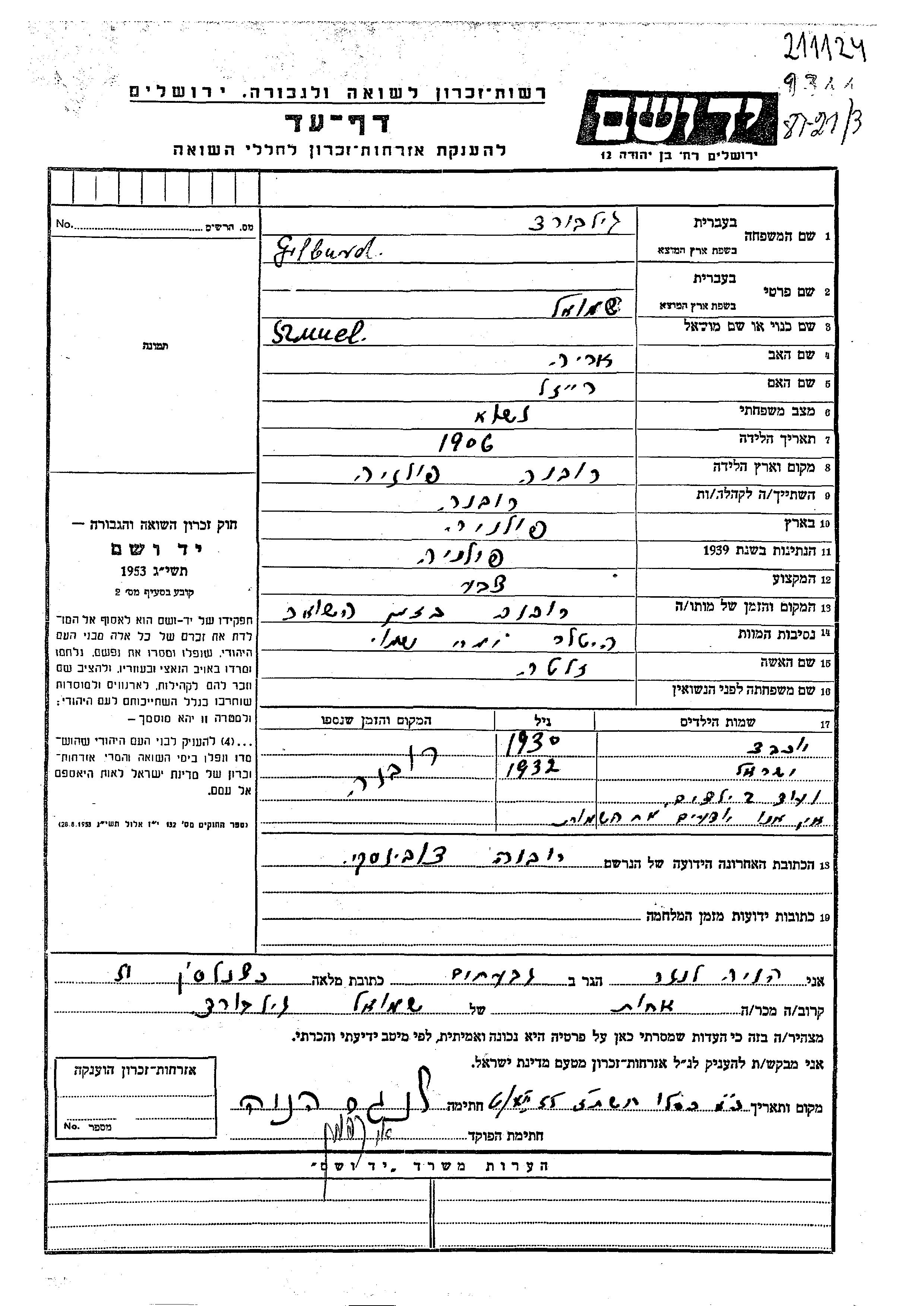 Szmuel Gilburd est né à Rowne, Pologne en 1906, fils de Arie et de Reizl. Il était Peintre en bâtiment et Mariée à Zlata. Au cours de la guerre, il était à Rovno, Pologne. Szmuel a été assassiné pendant la Shoah. Lieu de la mort: Rovno, Pologne.