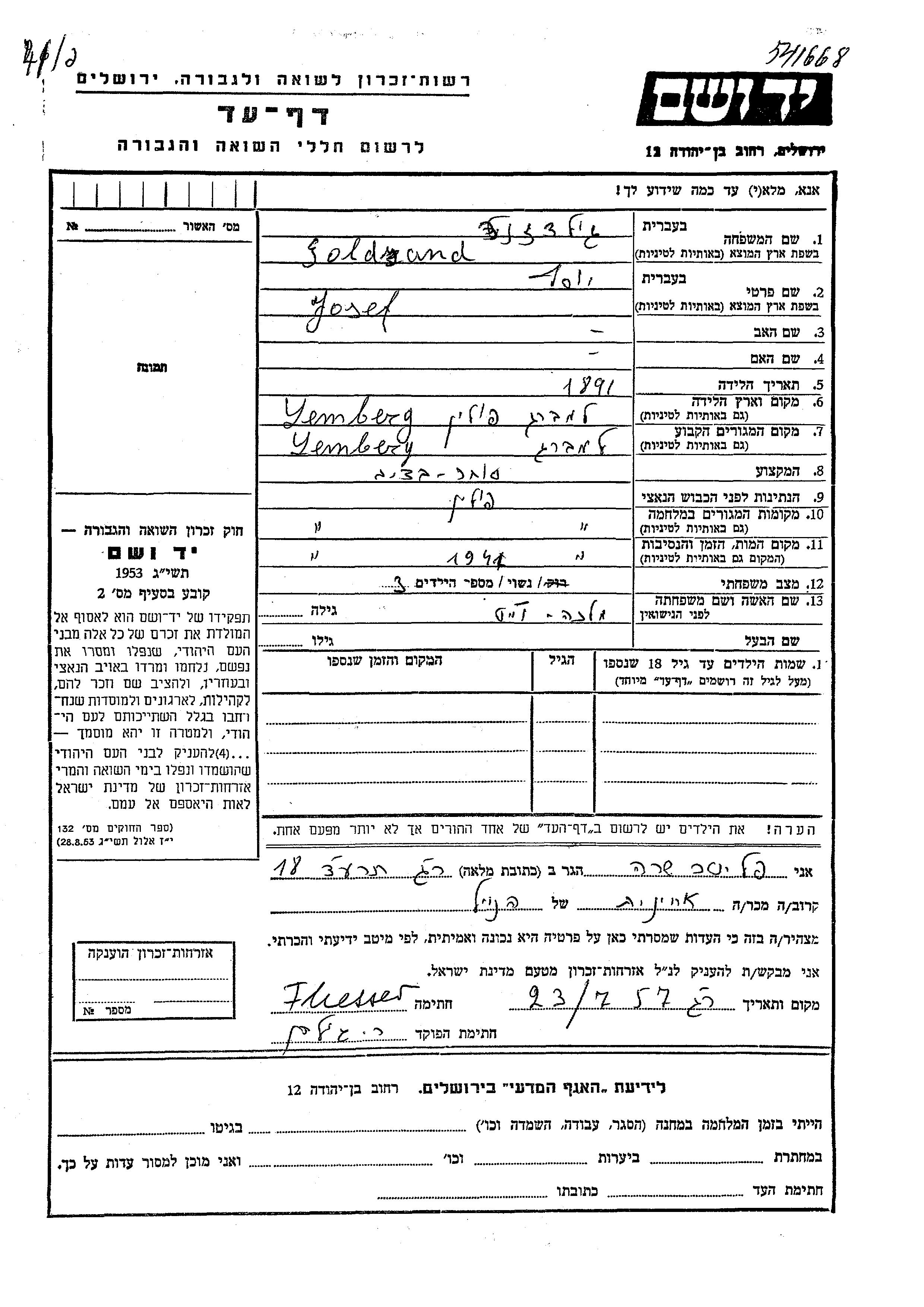 Goldzand Josef 1891 Lemberg, Pologne Feuille de témoignage