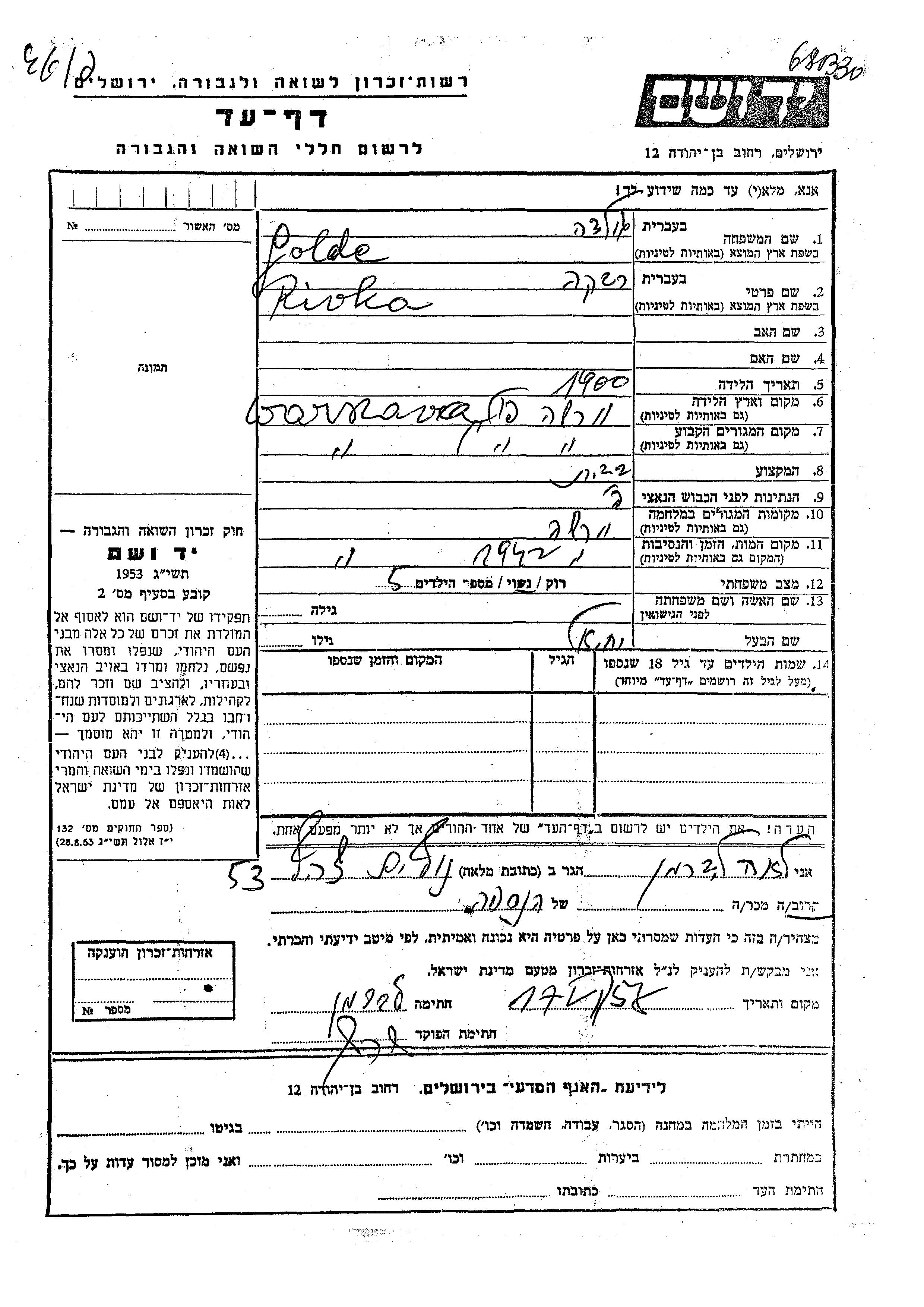 Rivka Golde est née à Warsaw, Pologne en 1900. Elle était Femme au foyer et Mariée à Yekhiel. Avant la seconde guerre mondiale elle vivait à Warsaw, Pologne. Pendant la guerre, elle était à Warsaw, Pologne.
