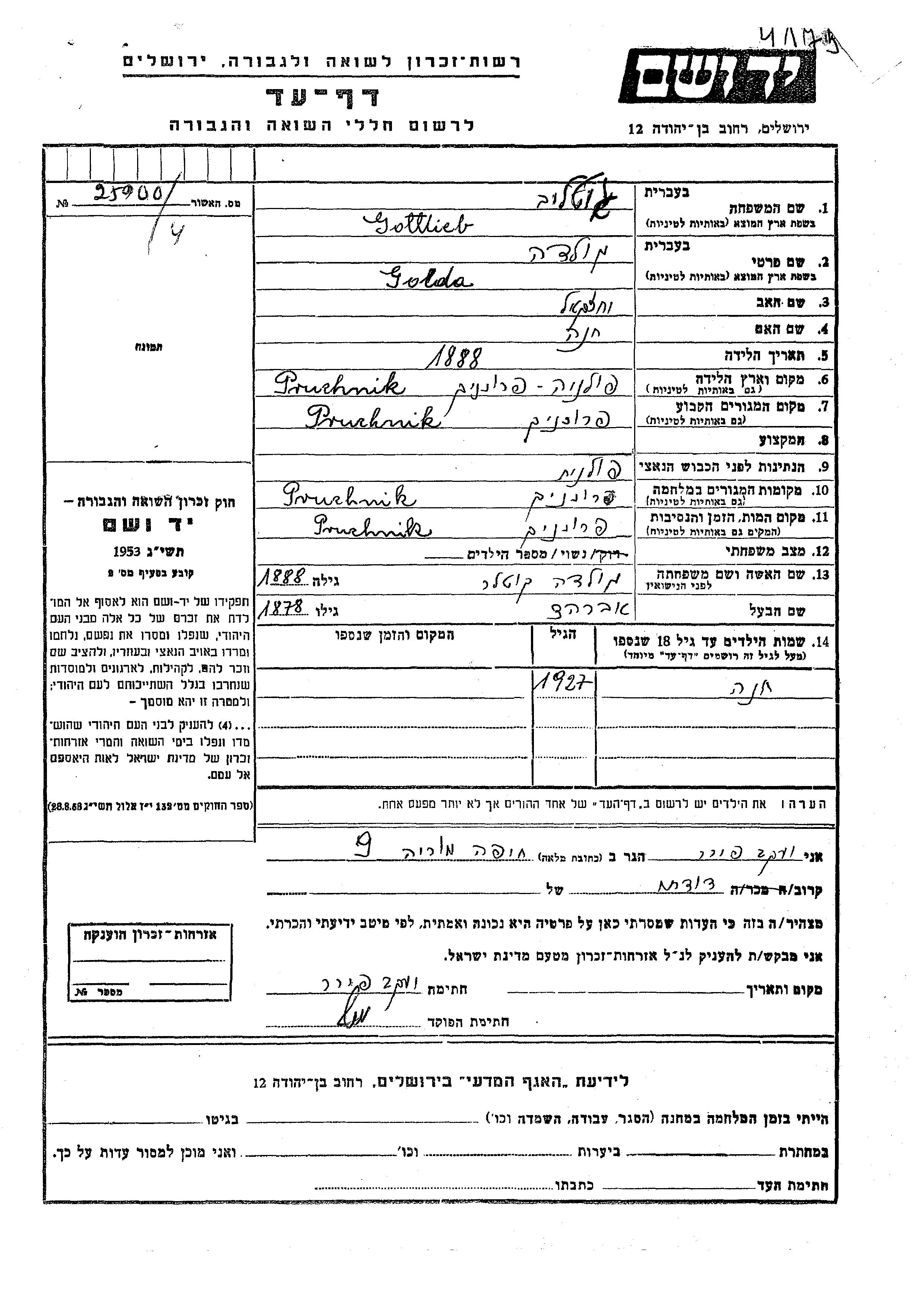 Gotlib Golda 1888 Pruchnik, Pologne Feuille de témoignage