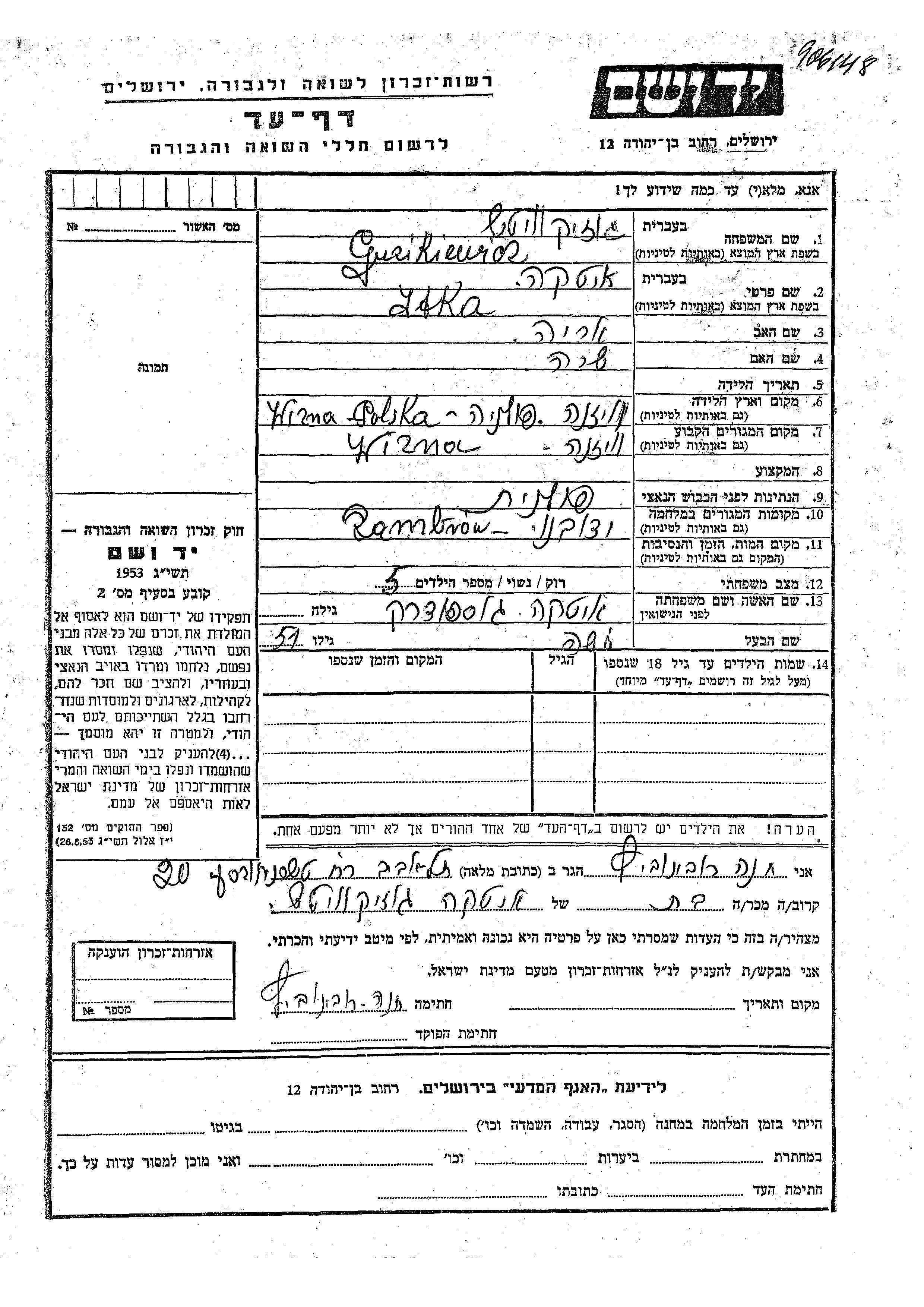 Yad Vashem - Pages of Testimony Names Memorial Collection