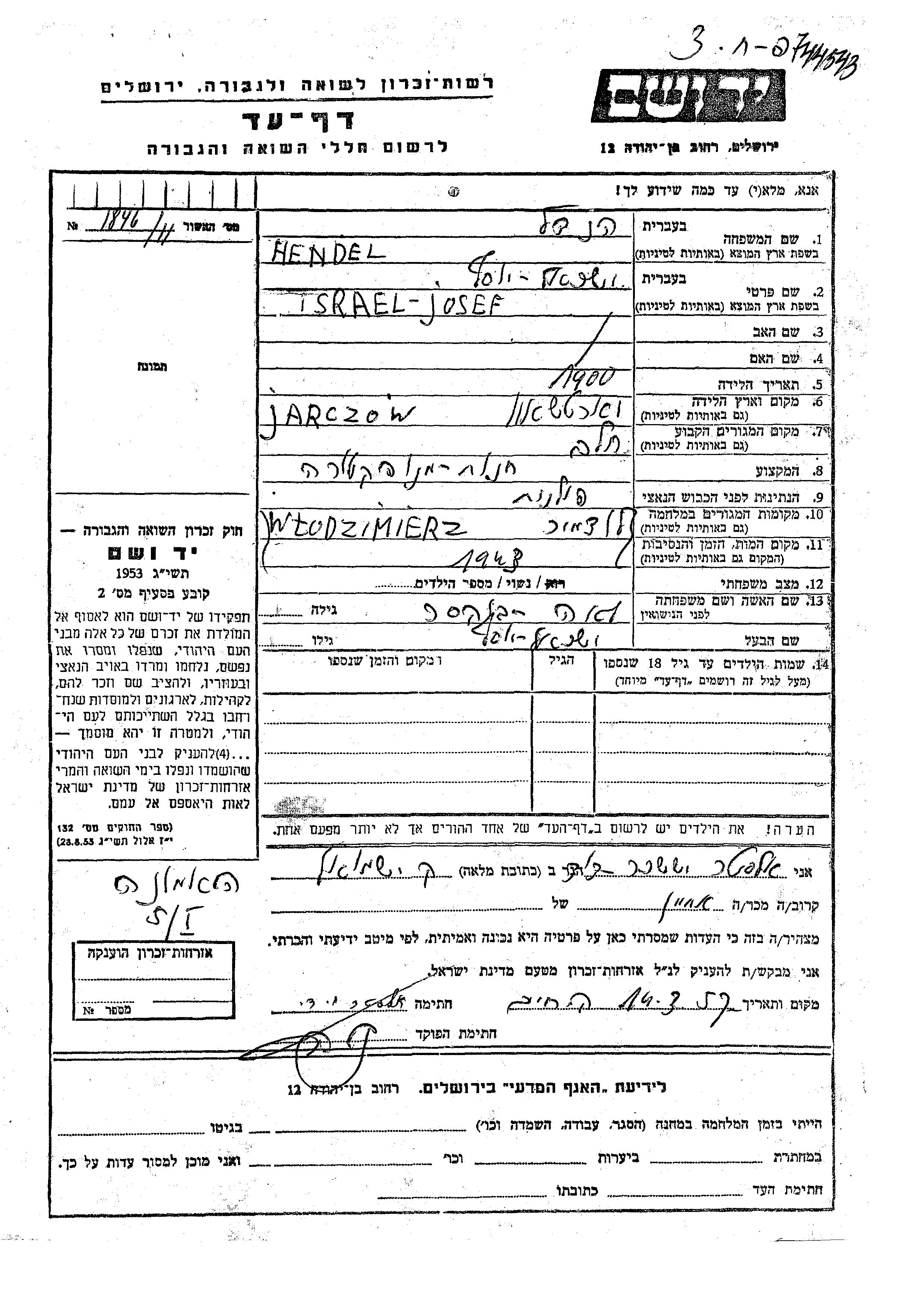 Israel Josef Hendel est né à Jarczow, Pologne en 1900. Il était Mariée à Lea née Bokser. Avant la seconde guerre mondiale il vivait à Chelm, Pologne. Au cours de la guerre, il était à Wlodzimierz, Pologne.