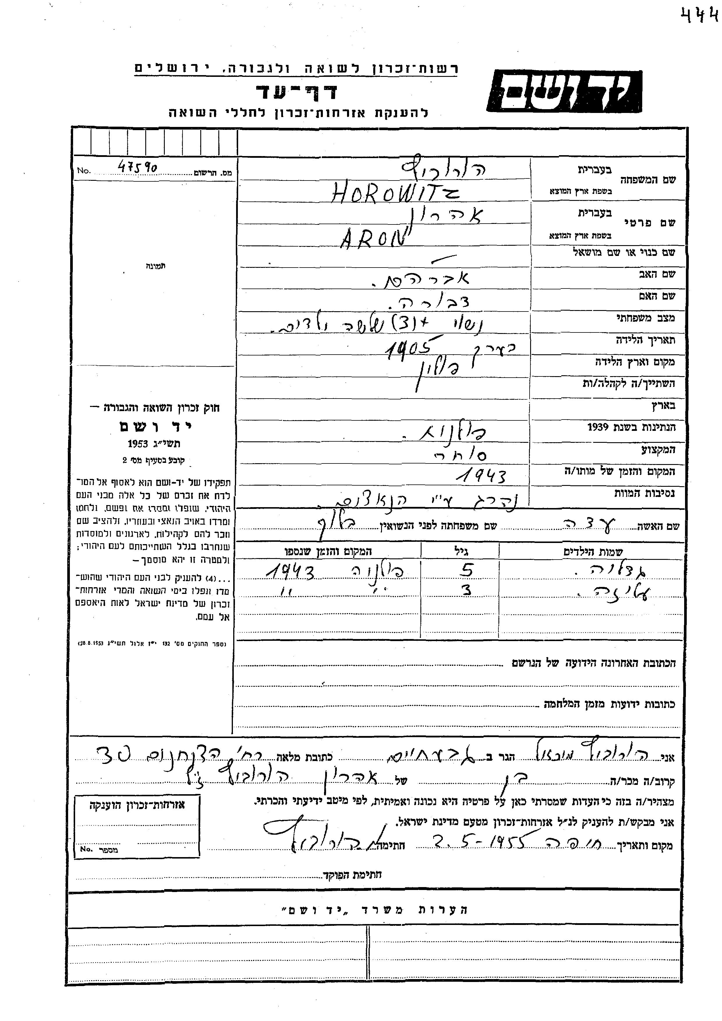 Horowitz Aron 1905 endroit inconnu, Feuille de témoignage