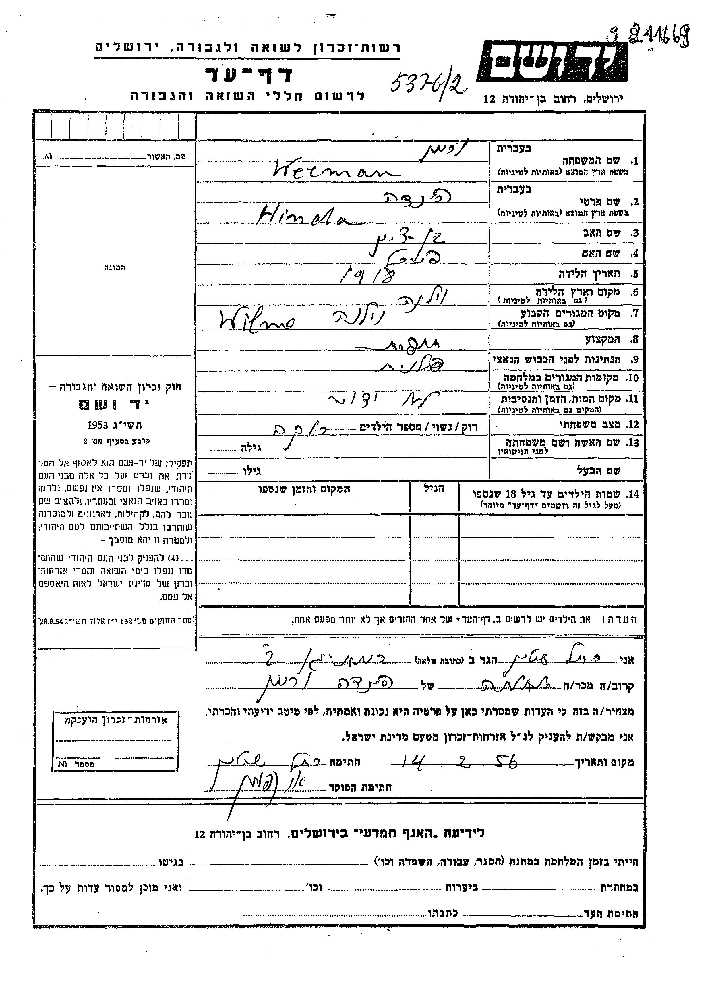 Werman Hinda 1918 Wilna, Pologne Feuille de témoignage