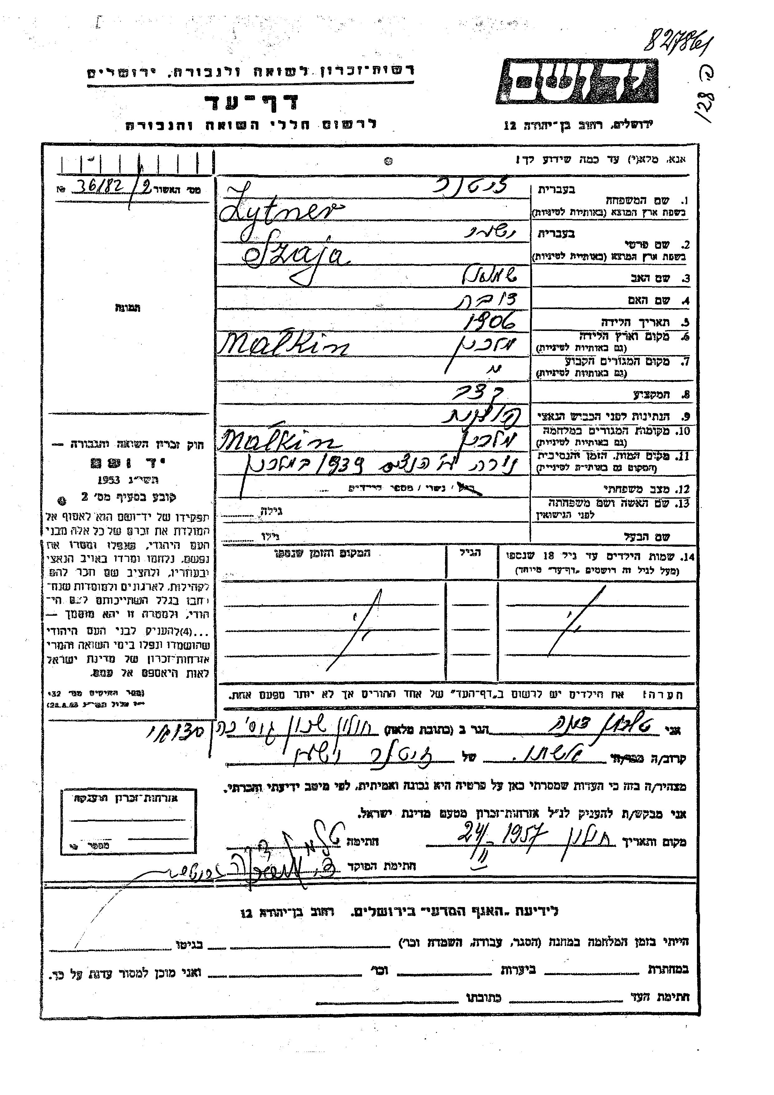 Zytner Szaja Yeshiyah 1906 Malkinia, Pologne Feuille de témoignage