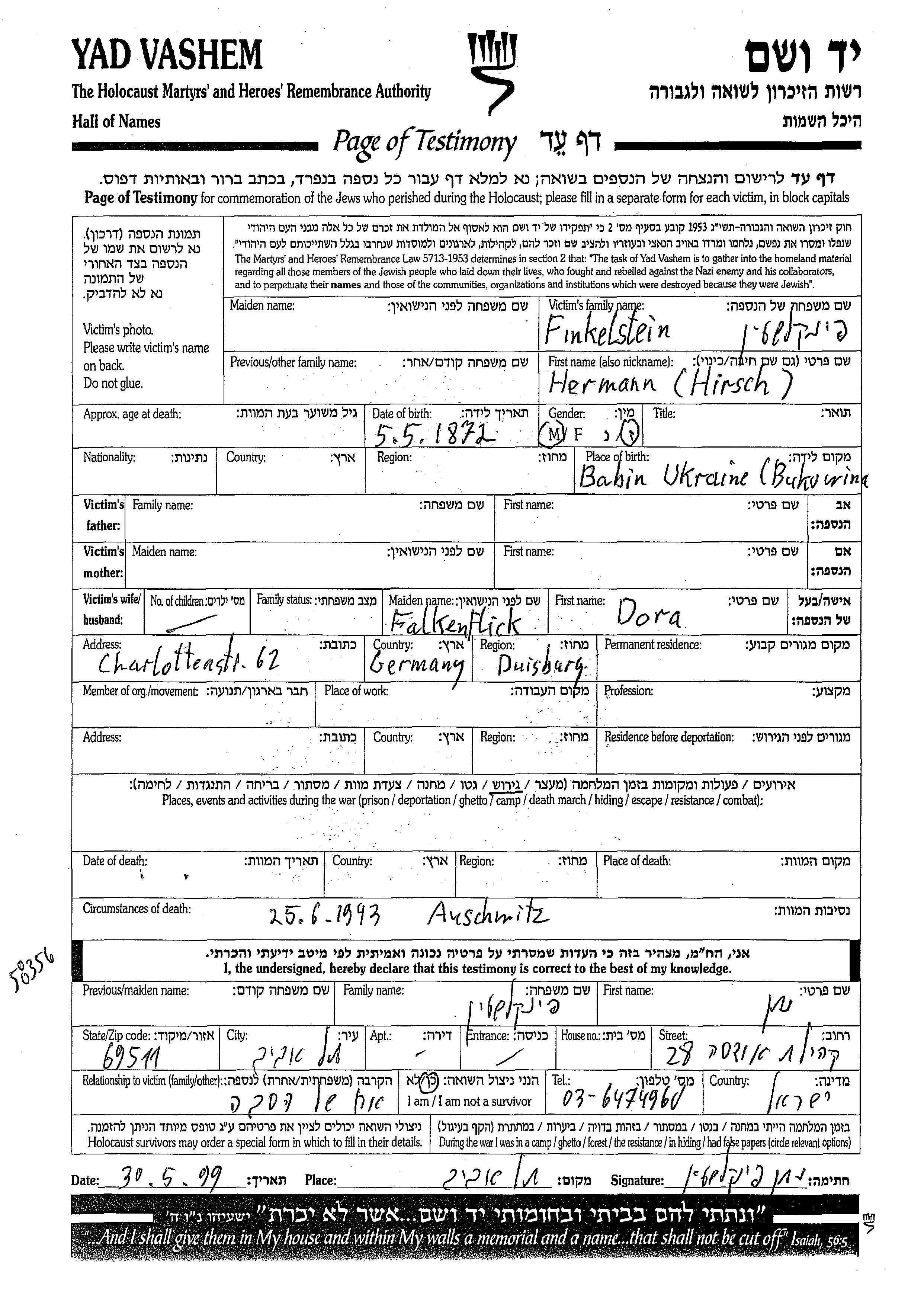 Hermann Hirsch Finkelstein est né à Babin, Roumanie en 1872. Il était Mariée à Dora née Falkenflick. Avant la seconde guerre mondiale il vivait à Duisburg, Allemagne.