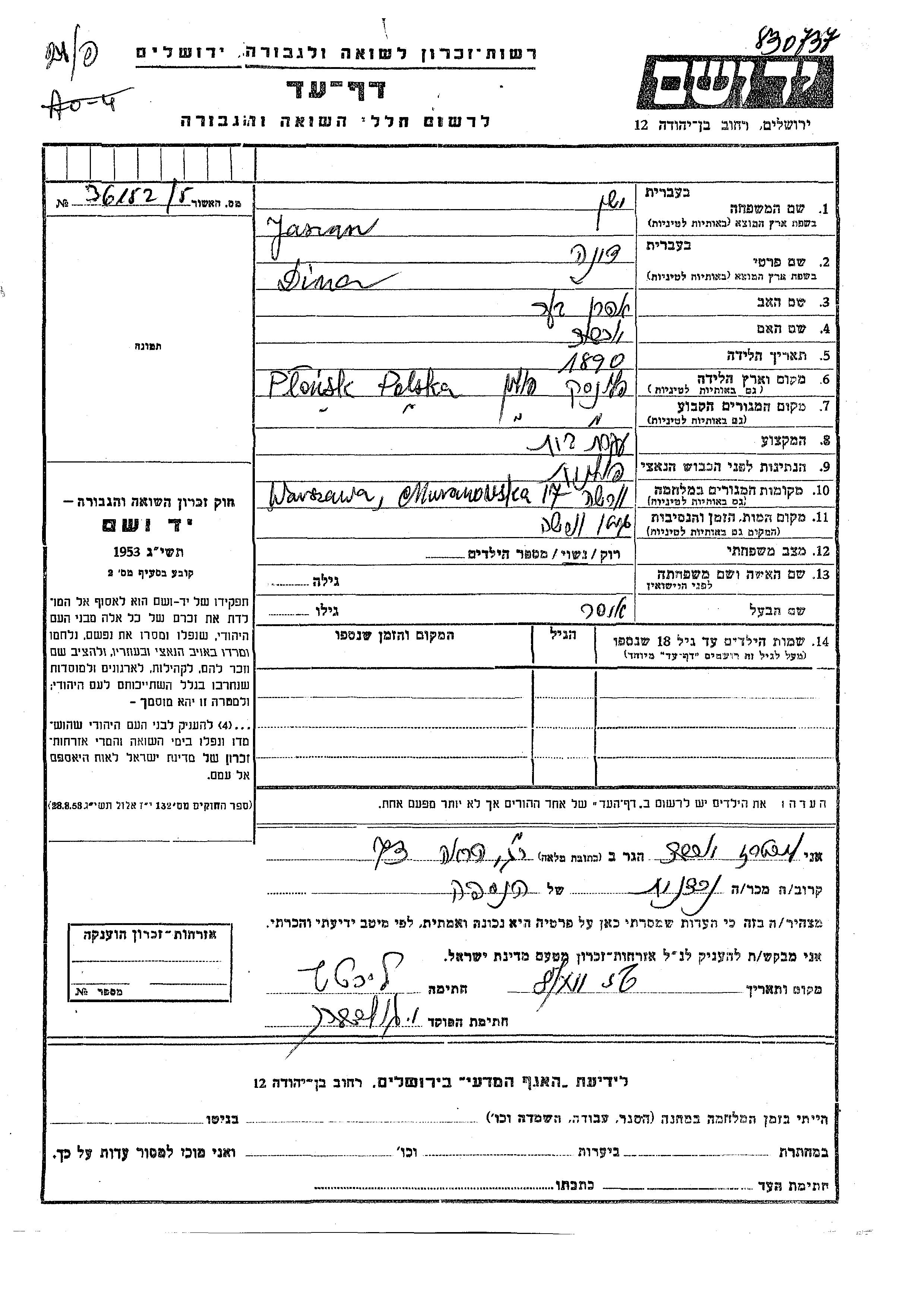 Jaszan Dina 1890 Plonsk, Pologne Feuille de témoignage
