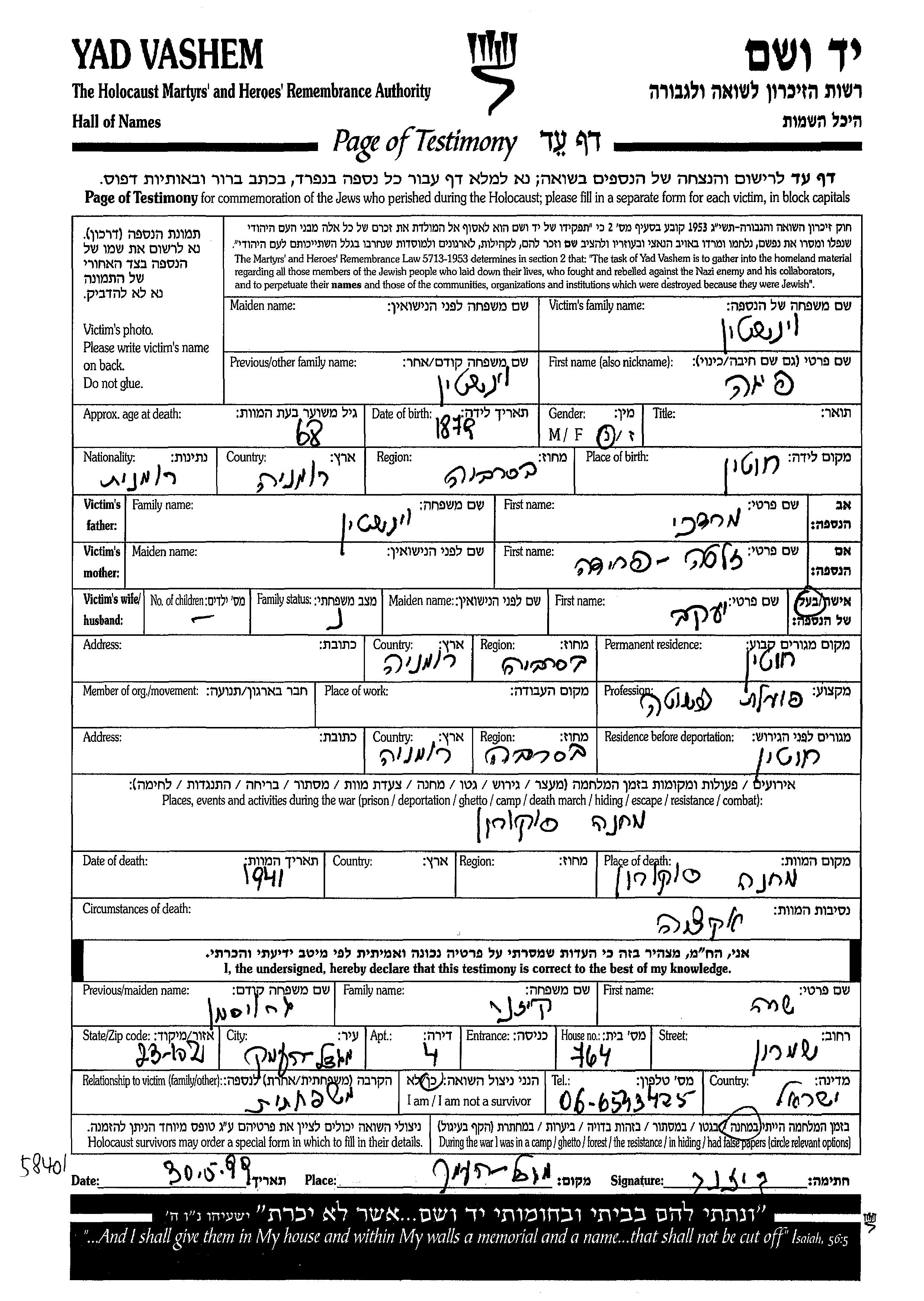 Yad Vashem - Pages of Testimony Names Memorial Collection