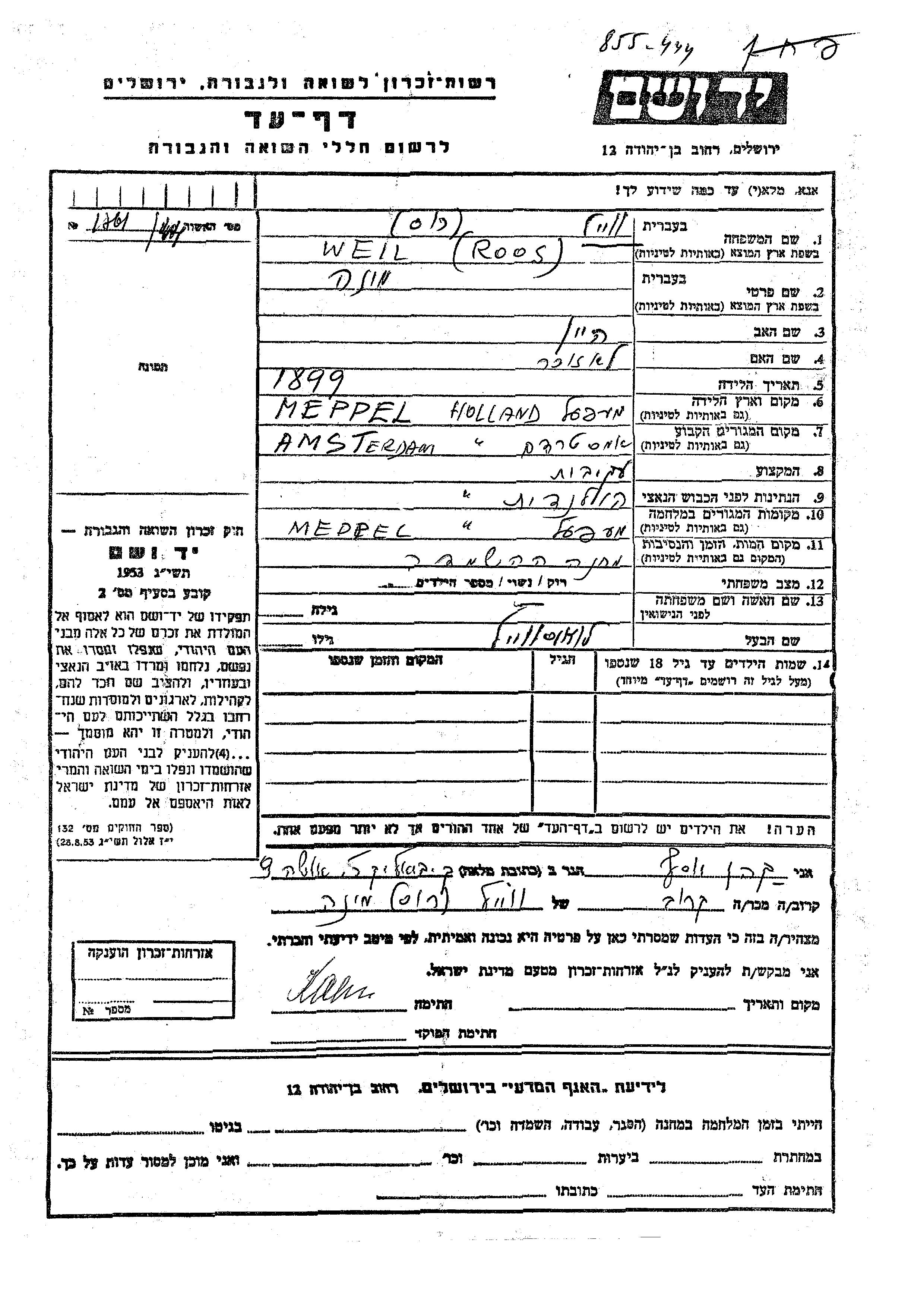 Weil Mona 1899 Amsterdam, Pays-Bas Feuille de témoignage