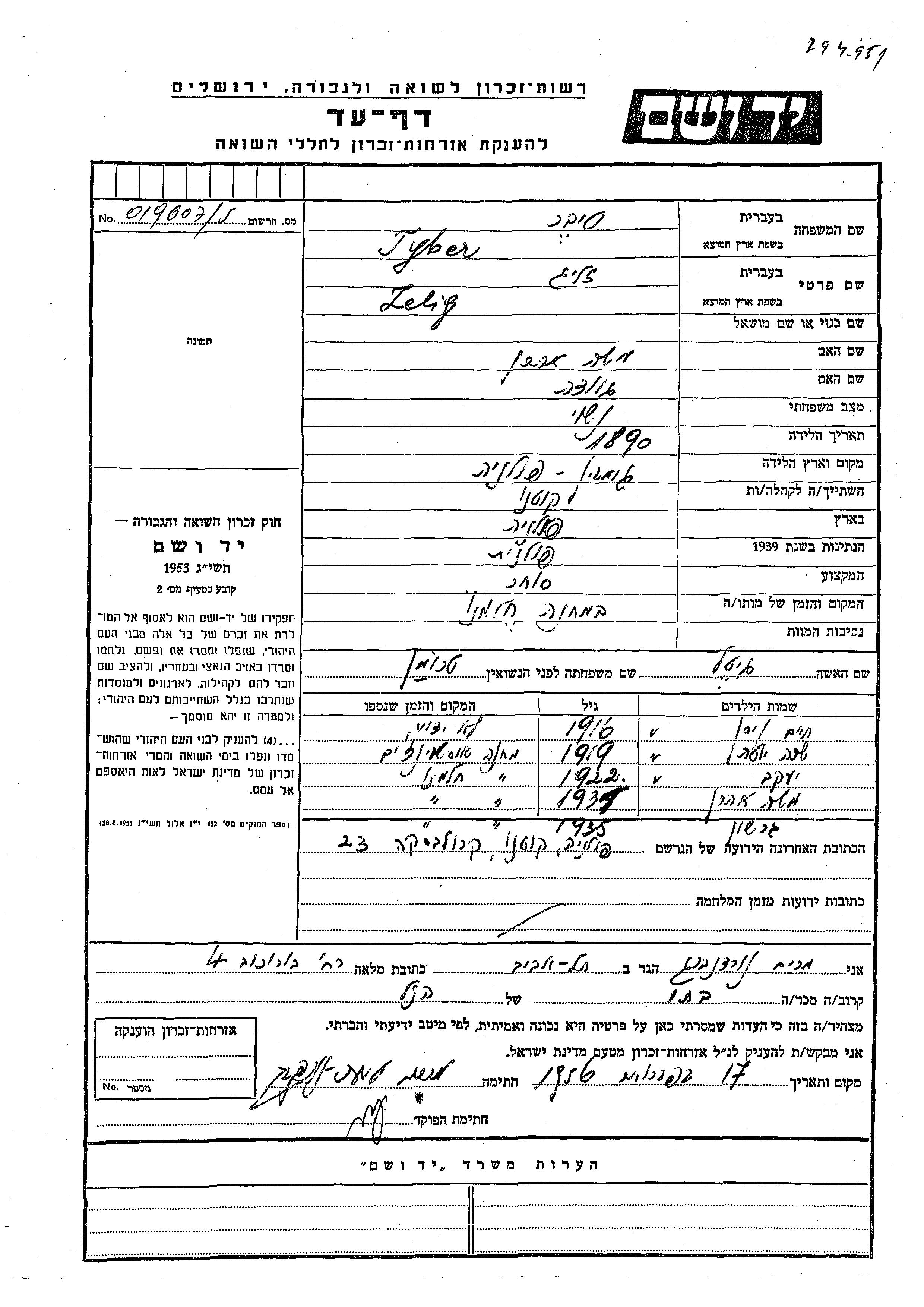 Tyber Zelig 1890 Kutno, Pologne Feuille de témoignage