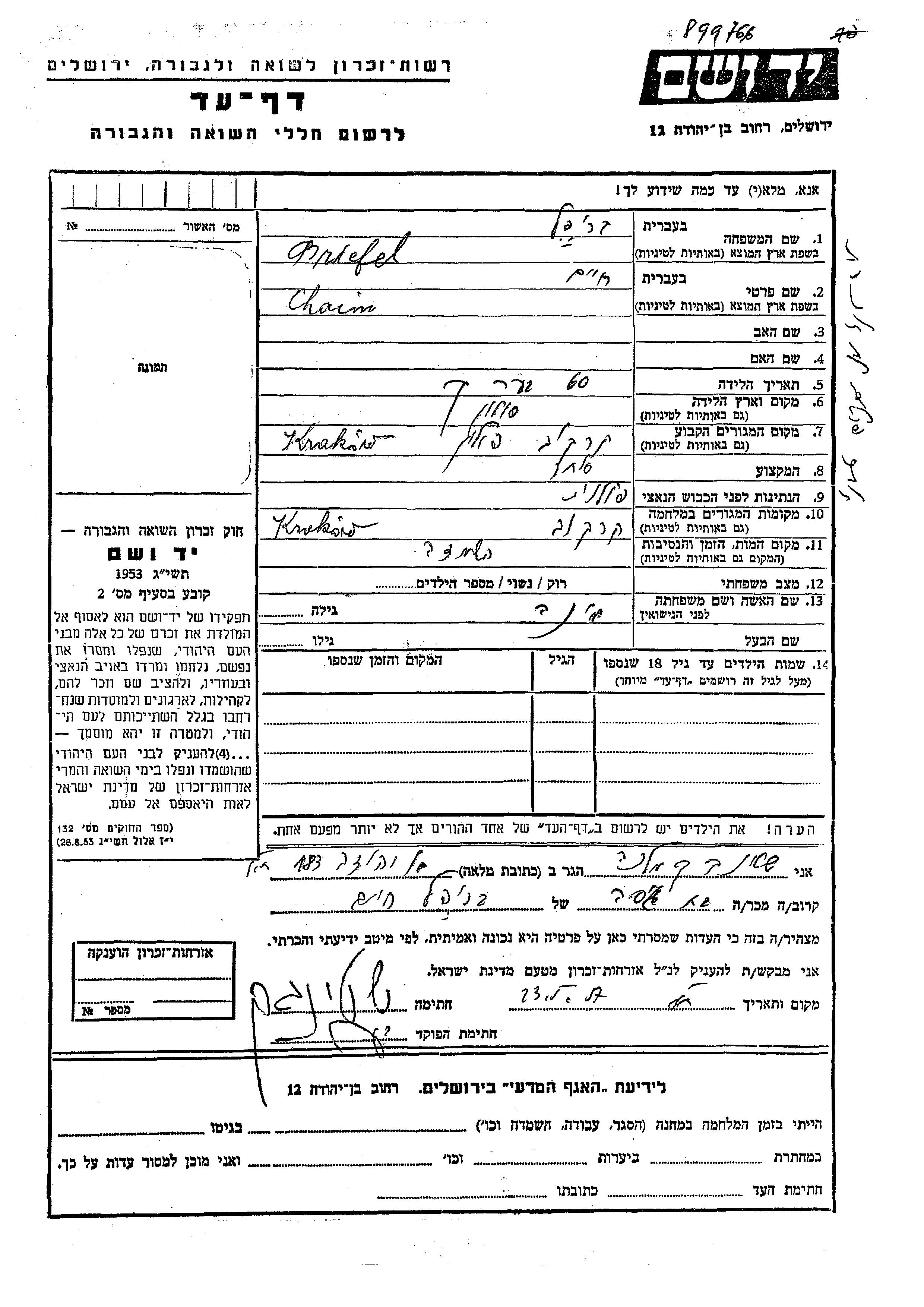 Briefel Chaim Krakow, Pologne Feuille de témoignage