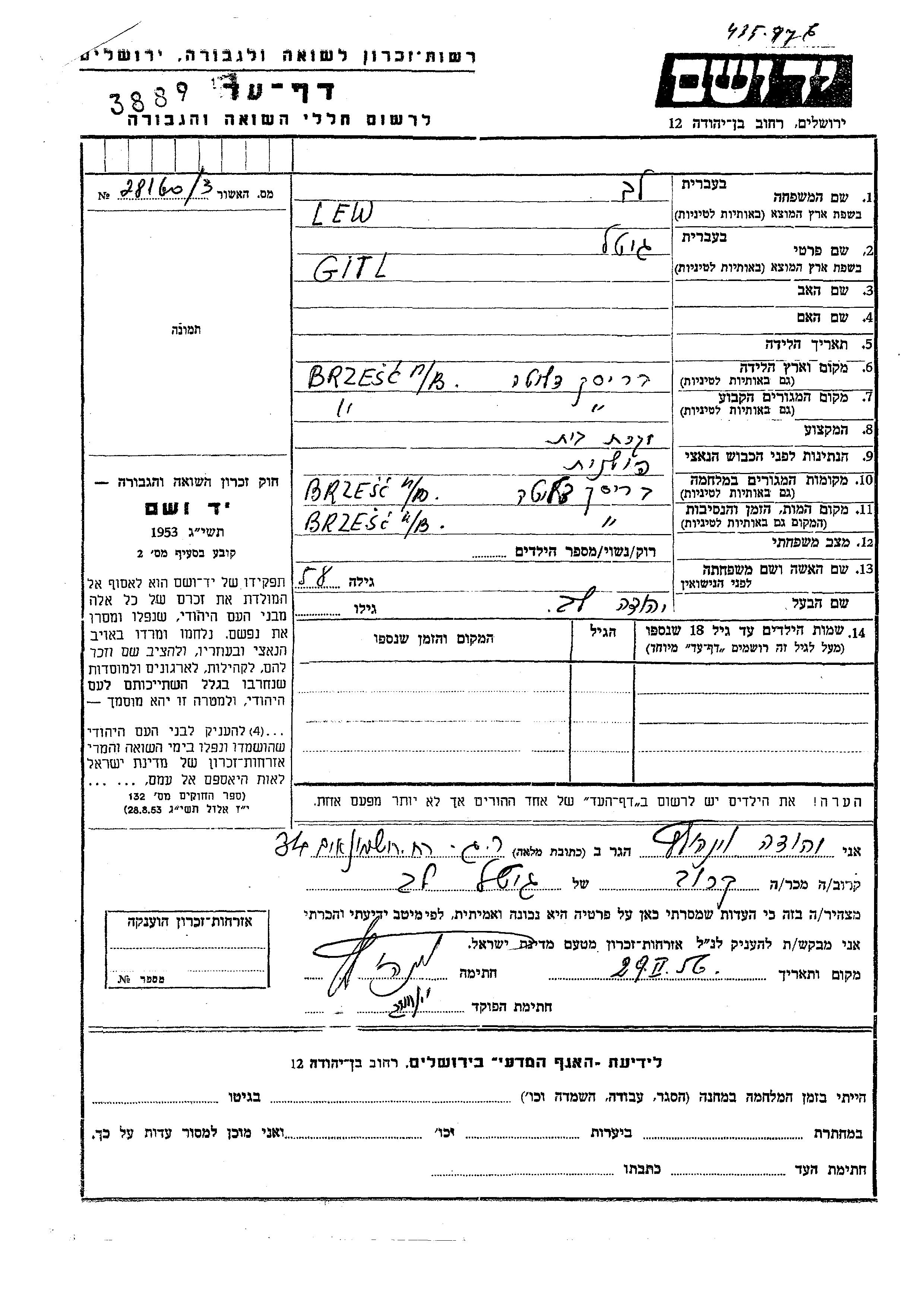 Lew Gitl Brzesc, Pologne Feuille de témoignage