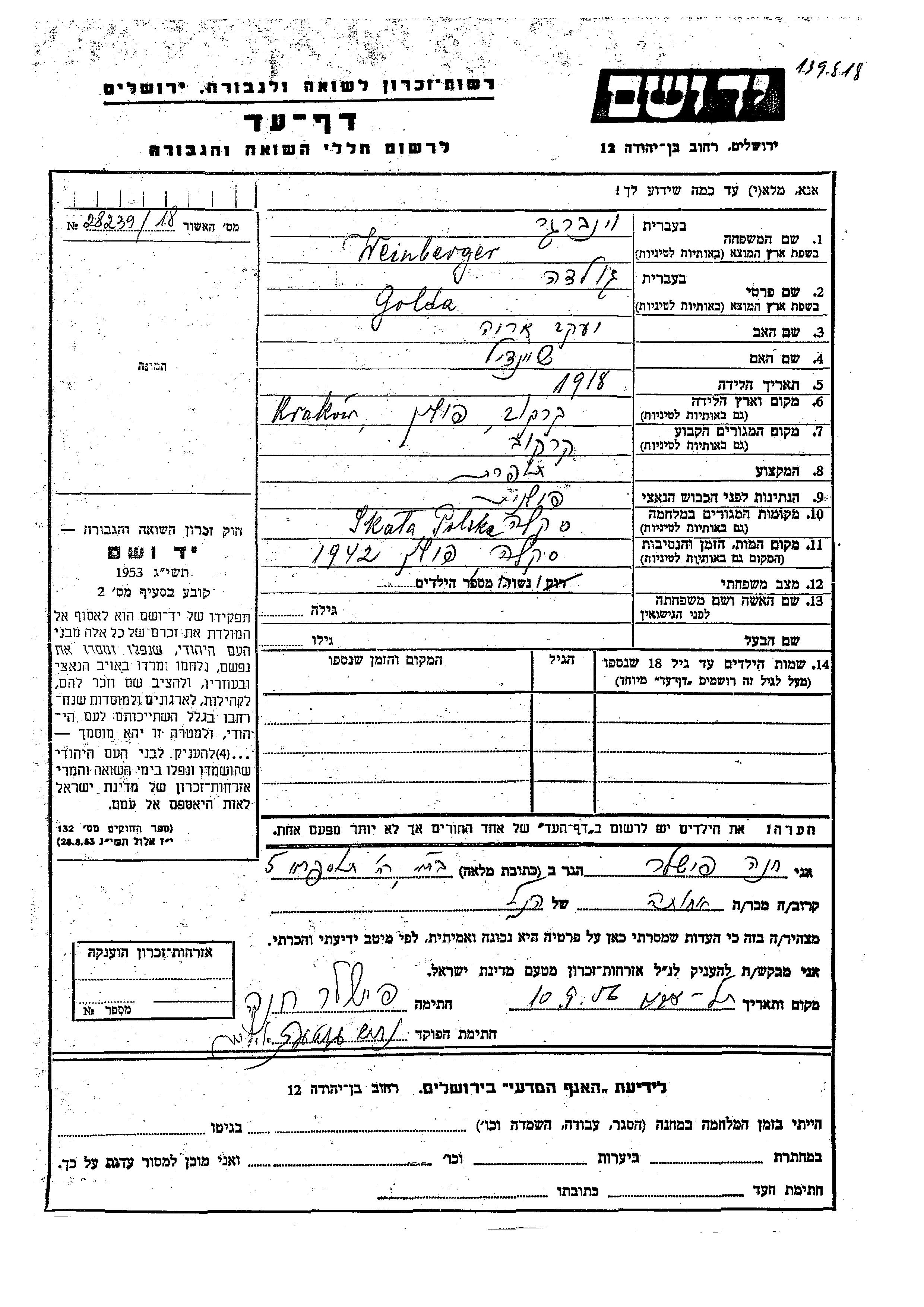 Golda Weinberger est née à Krakow, Pologne en 1918, fille de Yaakov Arie et de Sheindil. Elle était Couturière et Mariée. Avant la seconde guerre mondiale elle vivait à Krakow, Pologne. Pendant la guerre, elle était à Skala, Pologne.