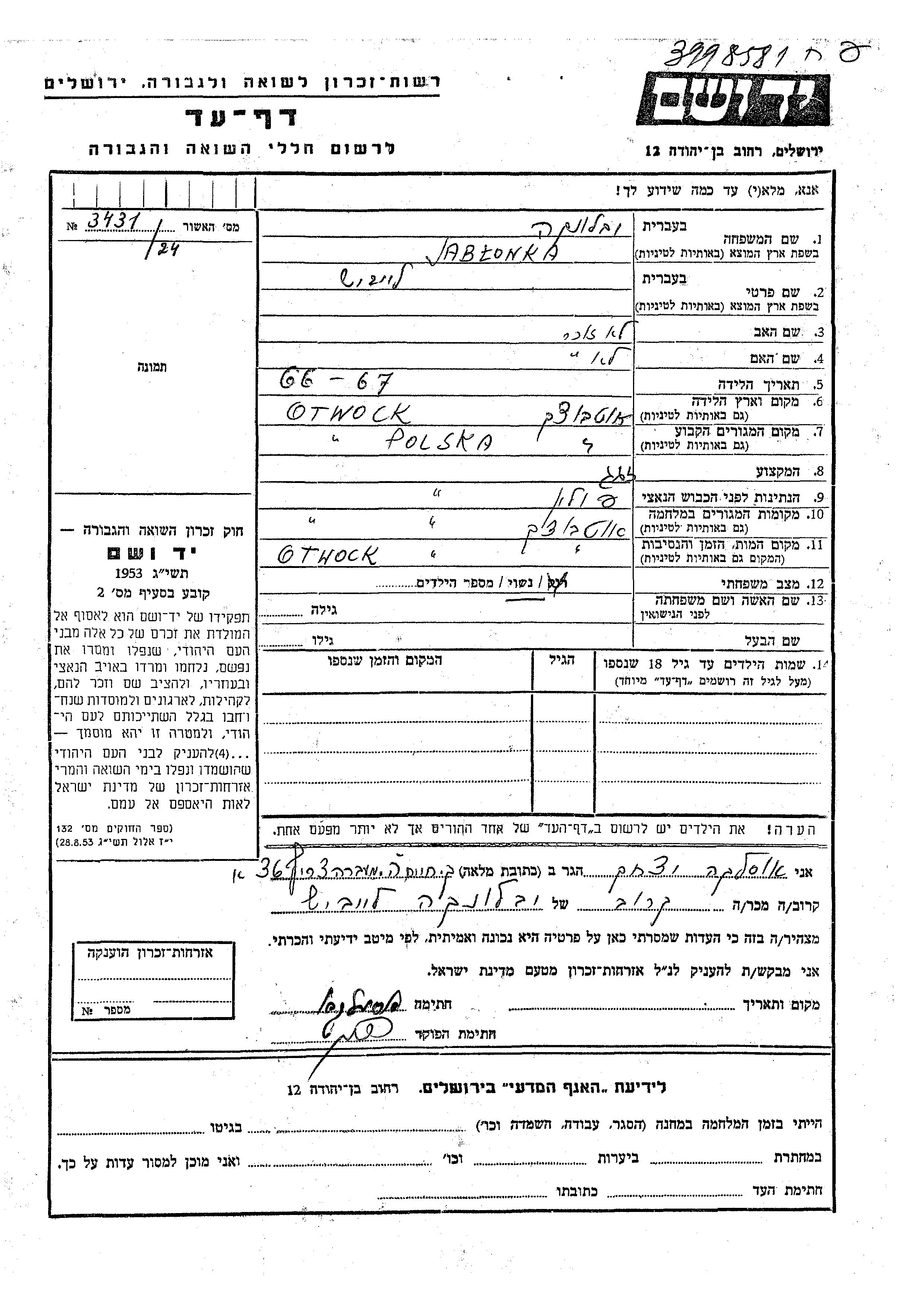 Jablonka Leibush Otwock, Pologne Feuille de témoignage