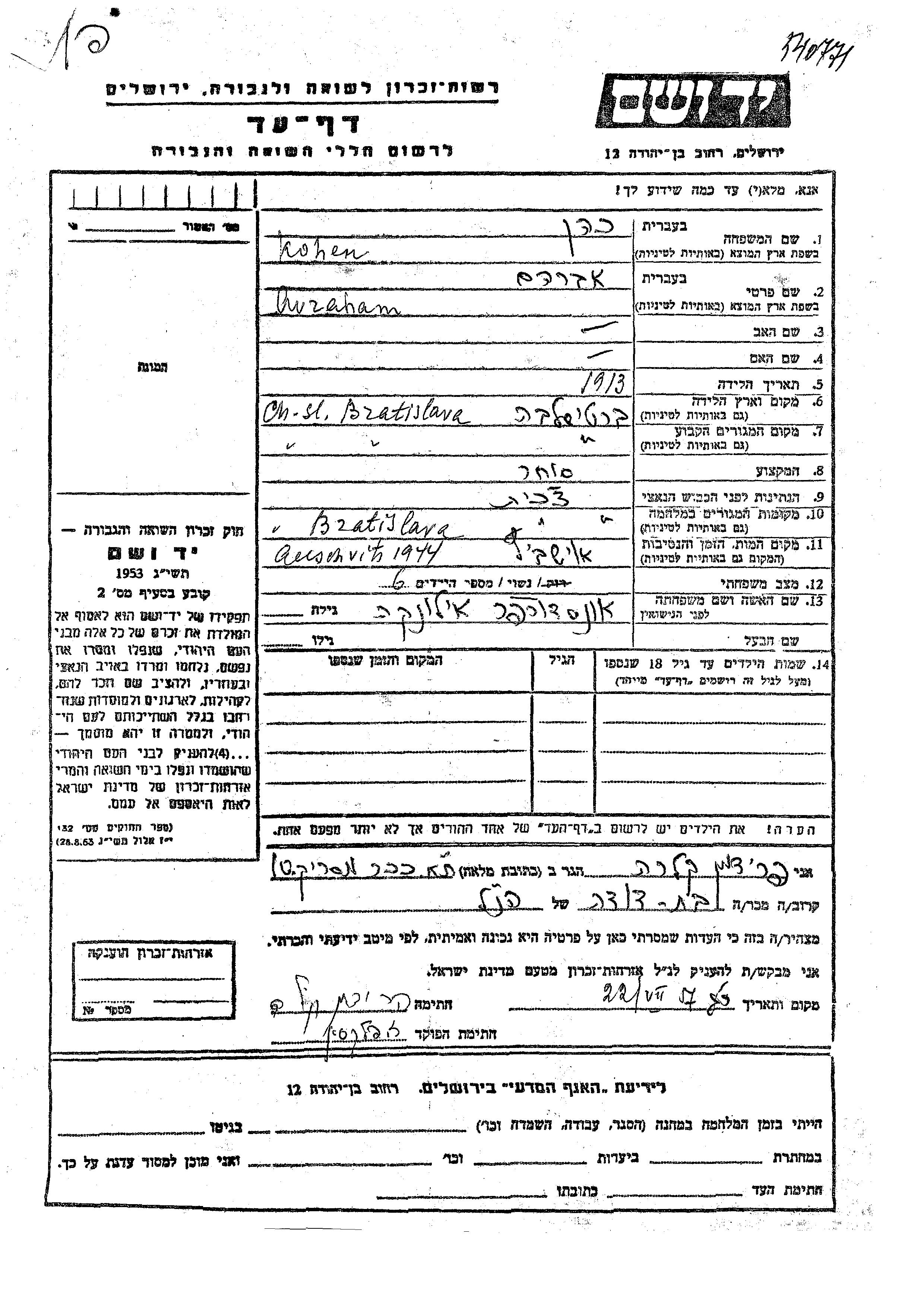 Kohen Avraham 1913 Bratislava, Tchécoslovaquie Feuille de témoignage