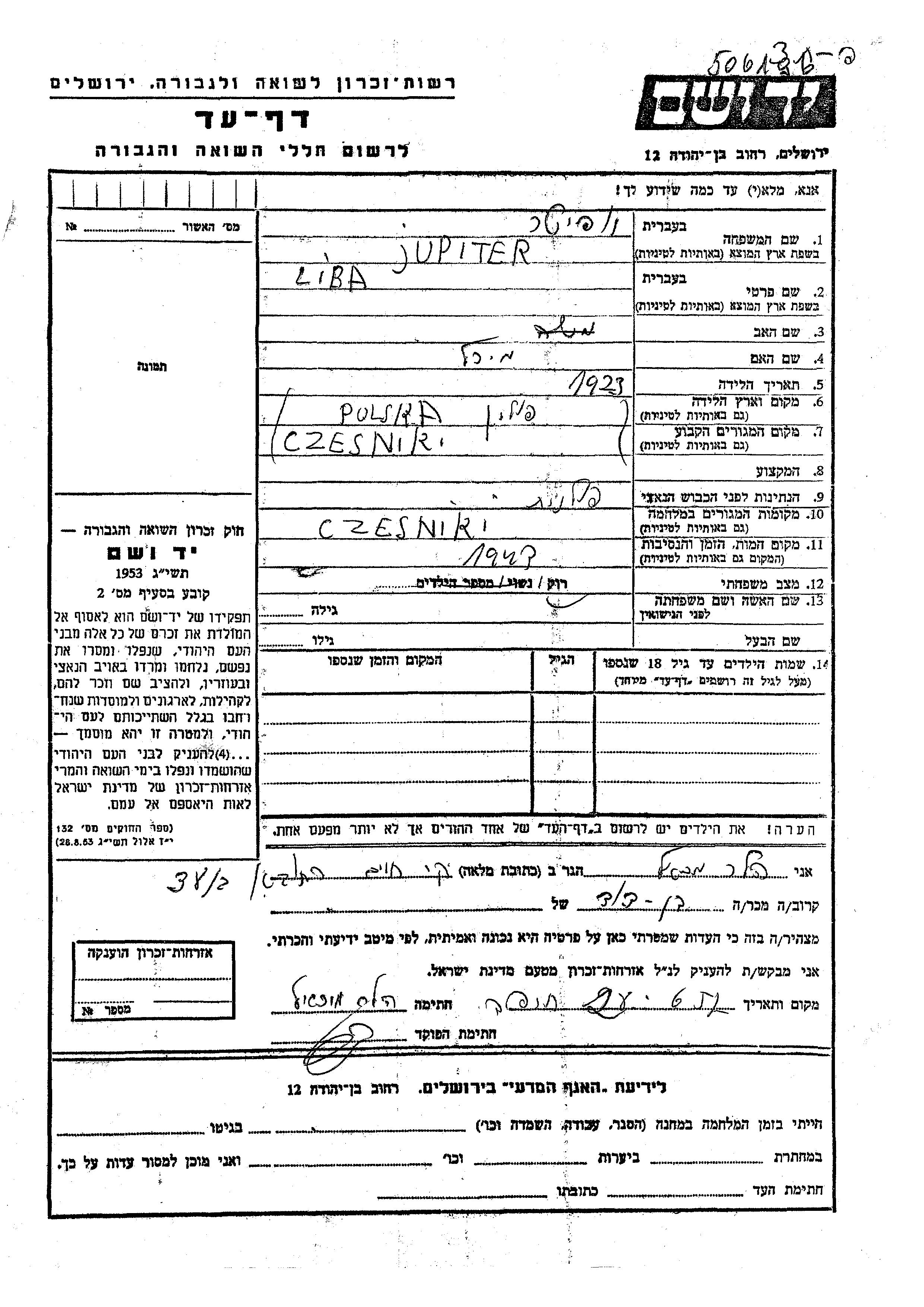 Liba Jupiter est née à Czesniki, Pologne en 1923, fille de Moshe et de Mikhal. Elle était Célibataire. Avant la seconde guerre mondiale elle vivait à Czesniki, Pologne. Pendant la guerre, elle était à Czesniki, Pologne.