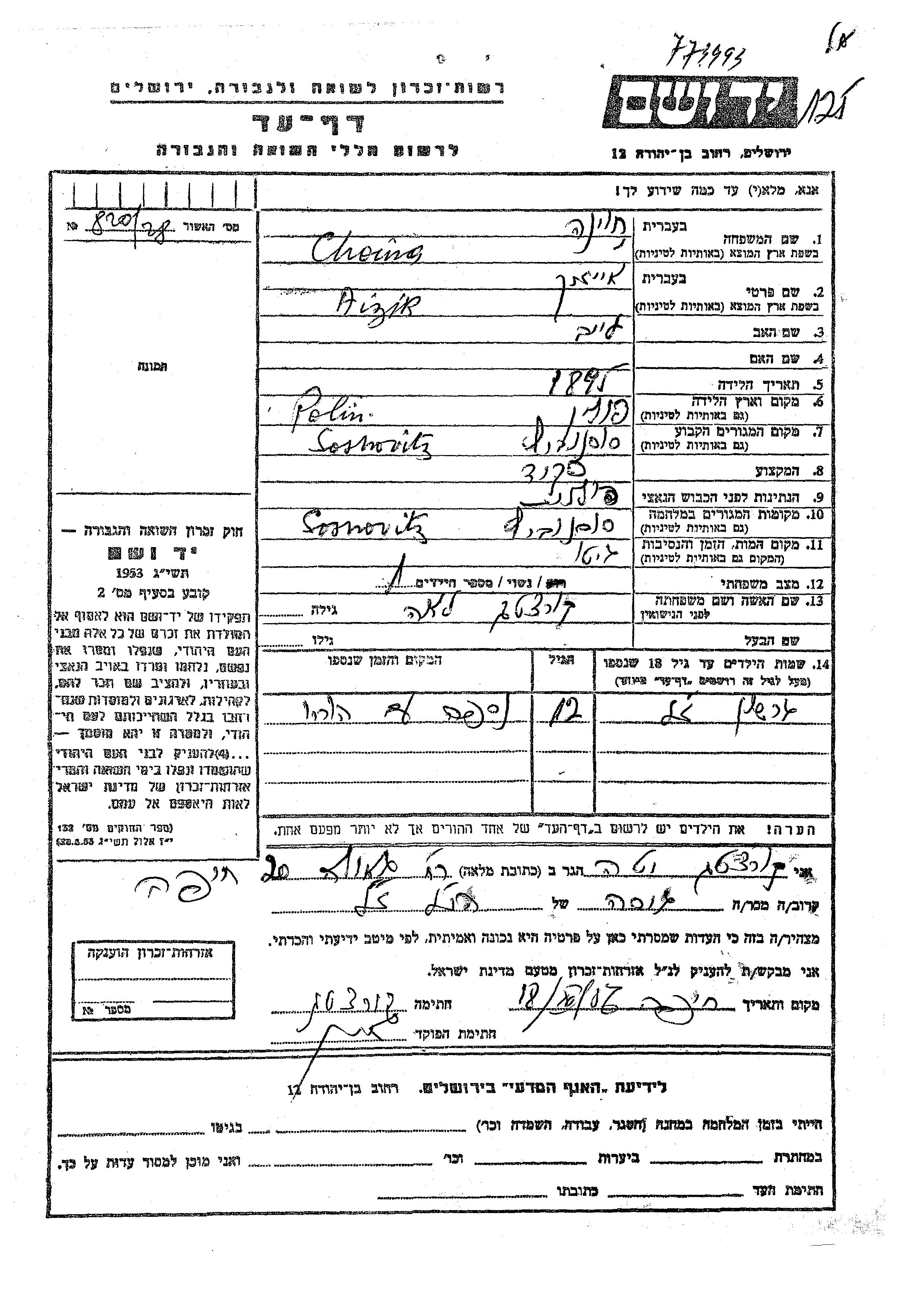 Aizik Choina est né à Pologne en 1895, fils de Leib. Il était Employé/e de bureau et Mariée à Lea née Kurtztag. Avant la seconde guerre mondiale il vivait à Sosnovice, Pologne. Au cours de la guerre, il était à Sosnovice, Pologne.