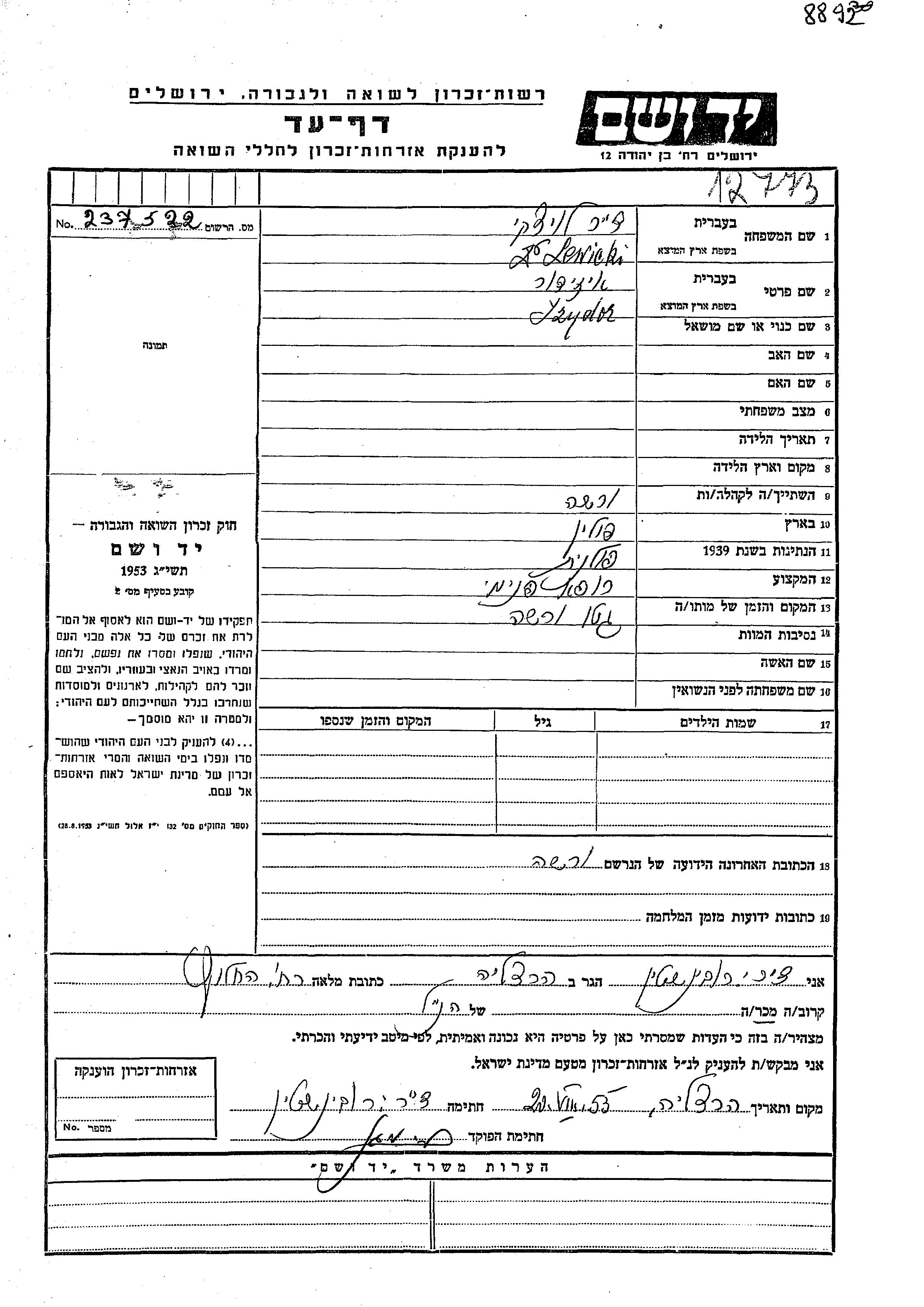 Lewicki Jzydor Warszawa, Pologne Feuille de témoignage