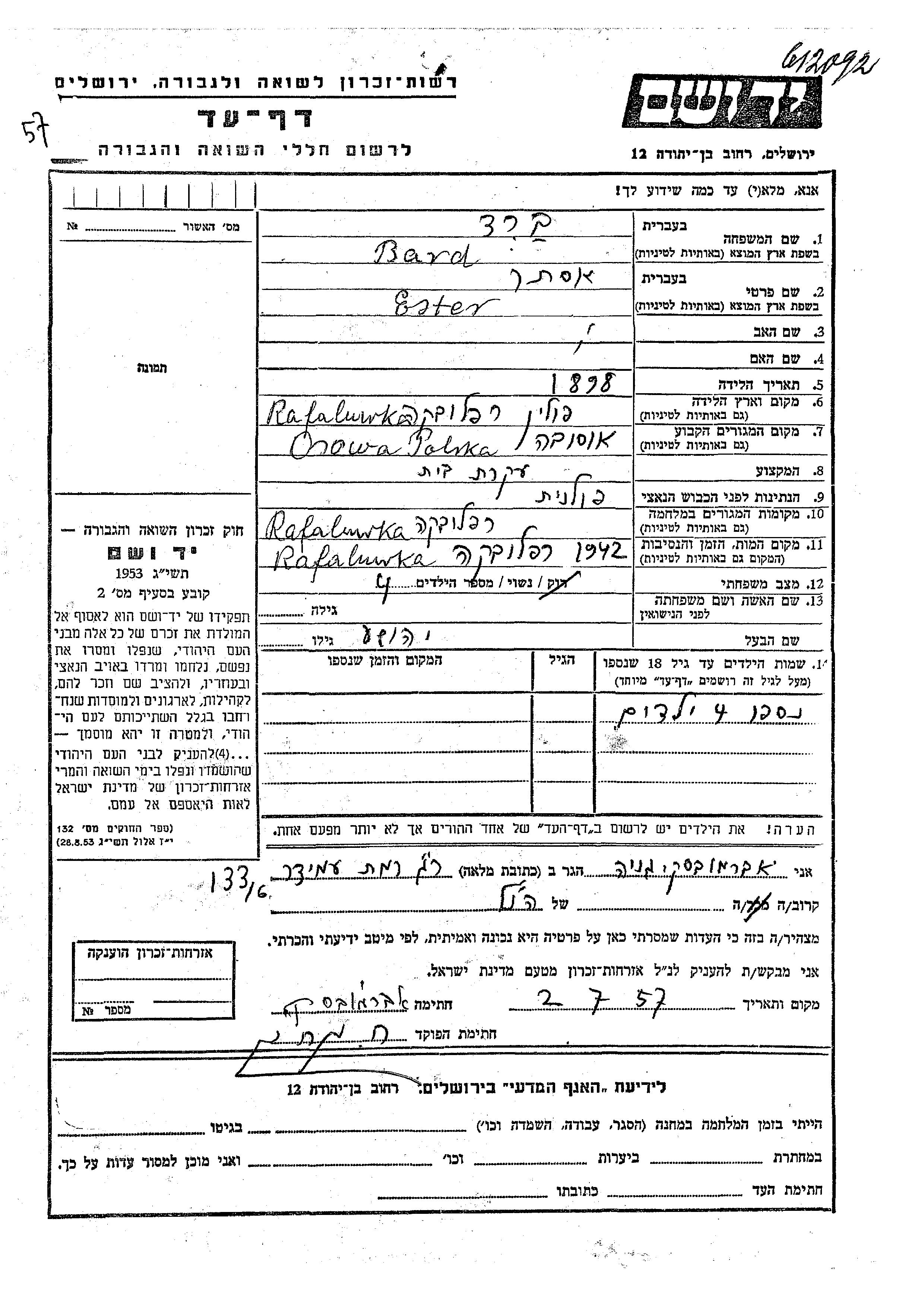 Ester Bard Bred est née à Rafałówka, Pologne en 1898. Elle était Femme au foyer et Mariée à Yehoshua. Avant la seconde guerre mondiale elle vivait à Osowa, Pologne. Pendant la guerre, elle était à Rafałówka, Pologne.
