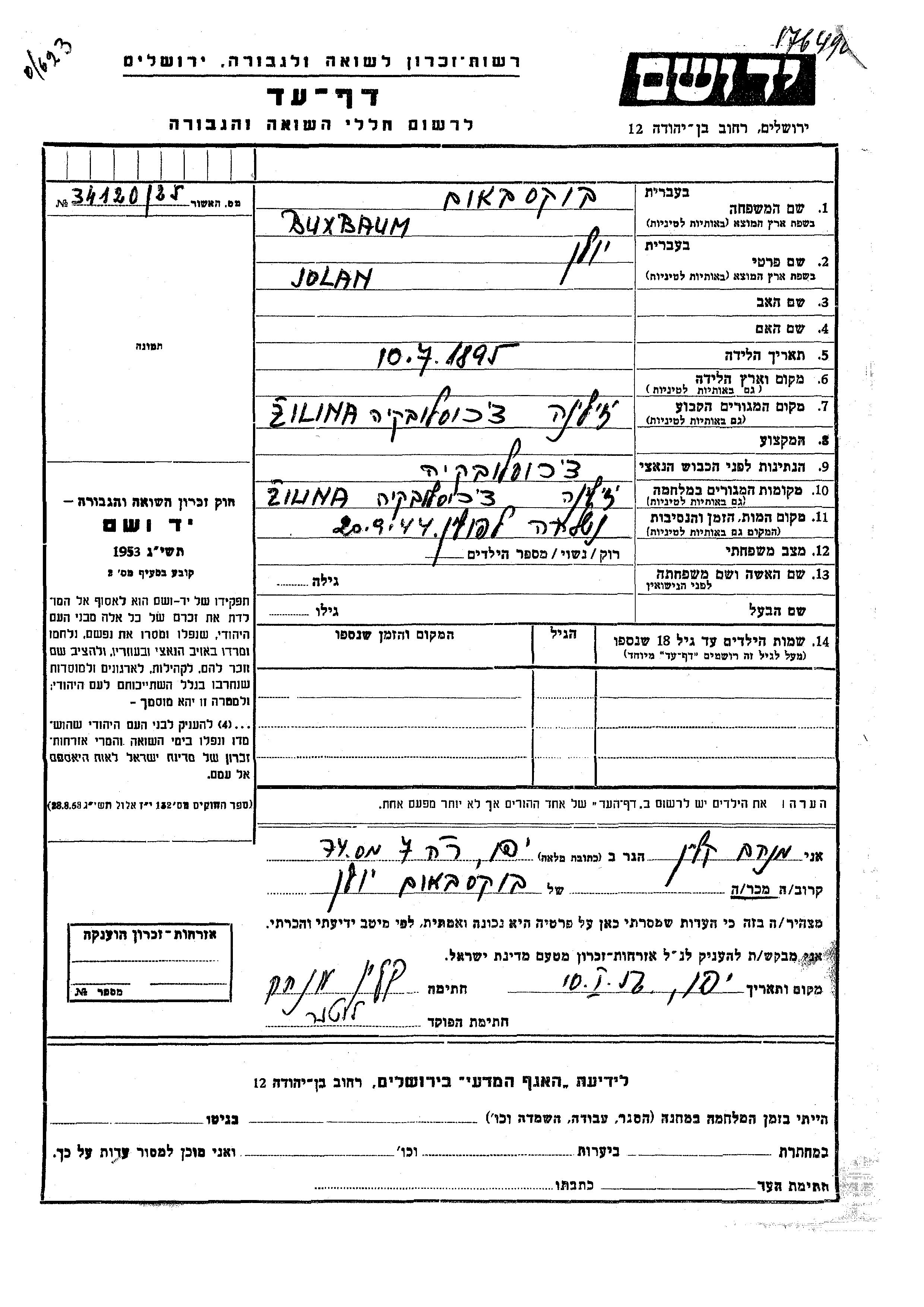 Buxbaum Jolan 1895 Zilina, Tchécoslovaquie Feuille de témoignage