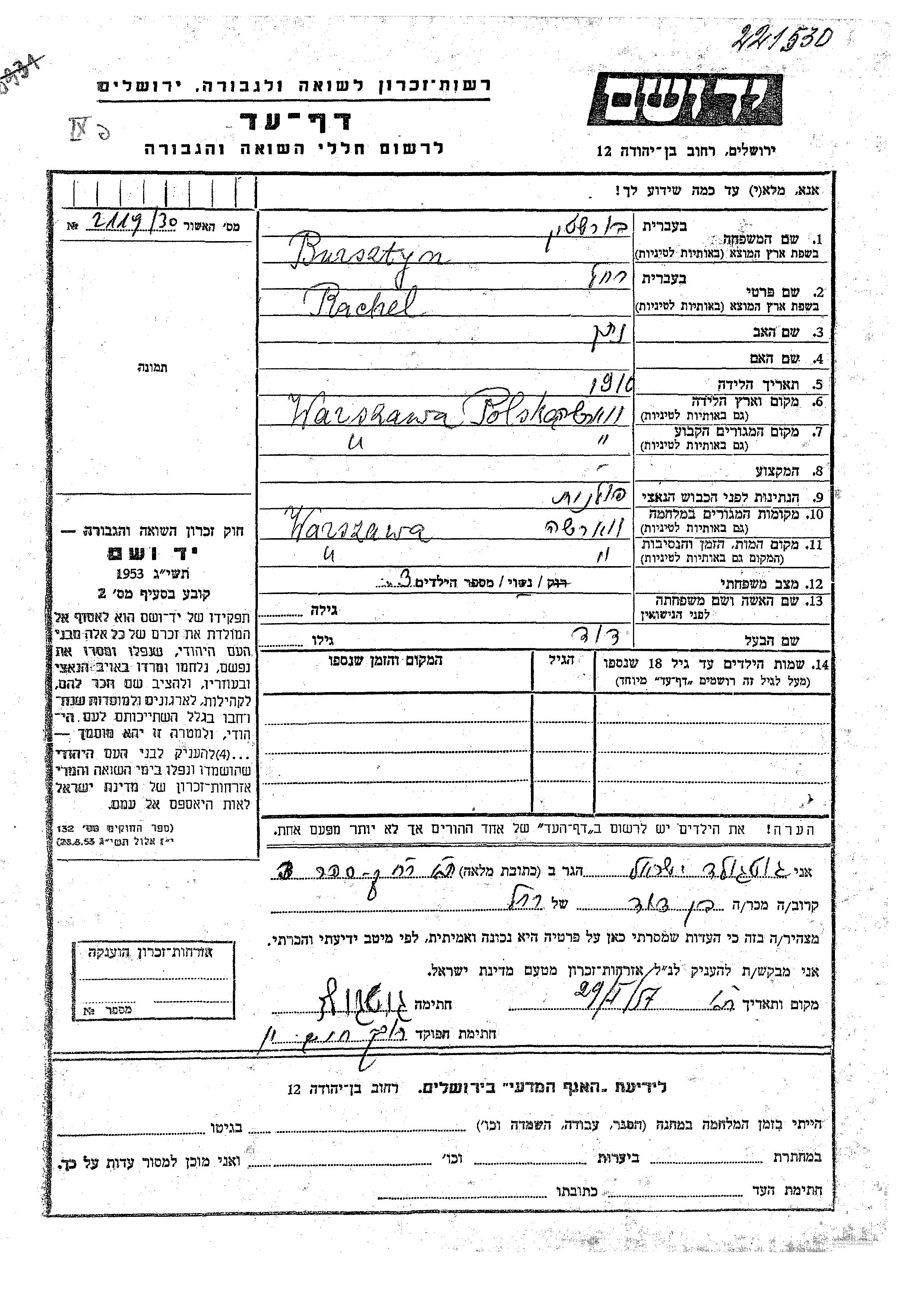 Bursztyn Rachel 1910 Warszawa, Pologne Feuille de témoignage