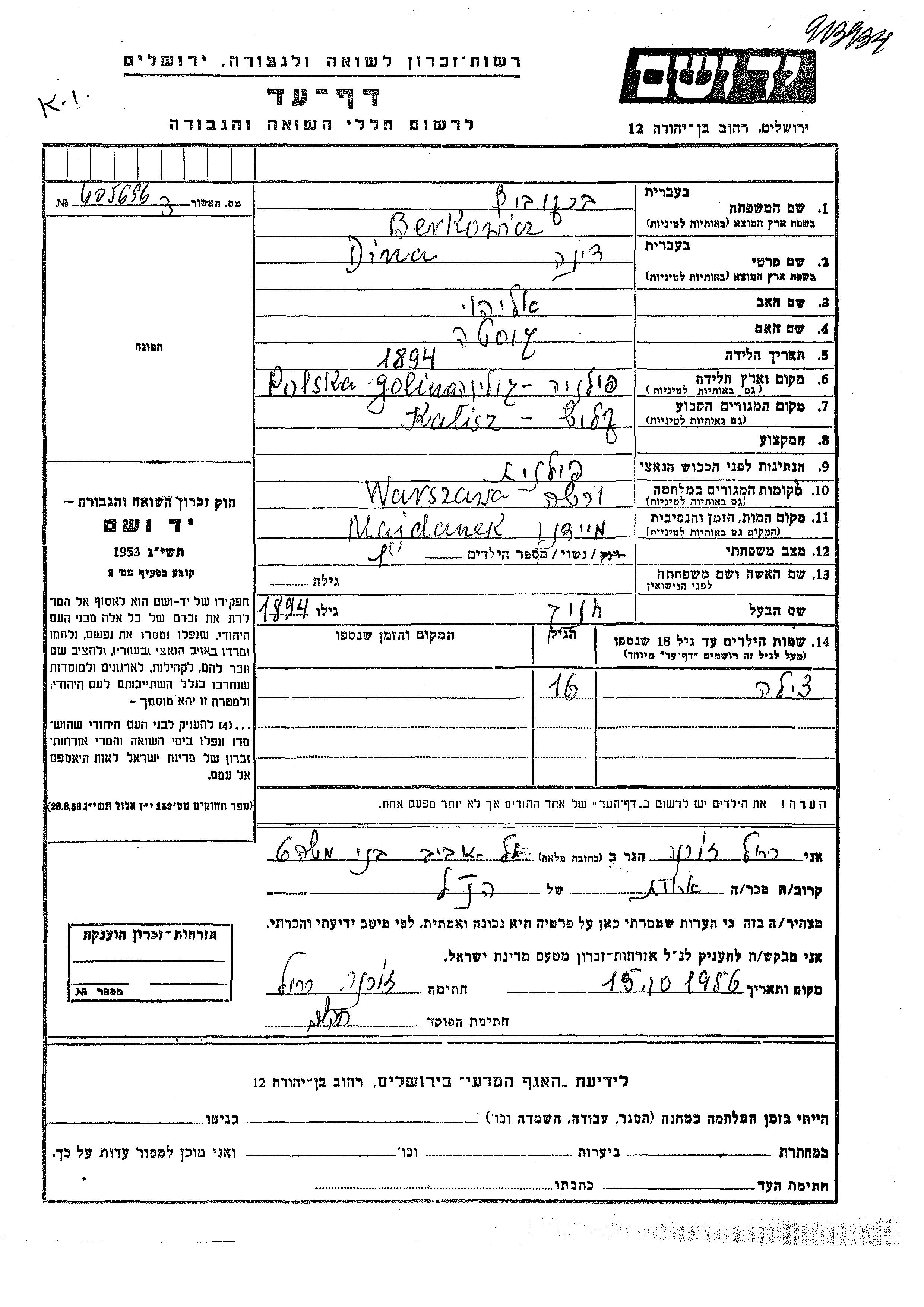 Berkowicz Dina 1894 Kalisz, Pologne Feuille de témoignage