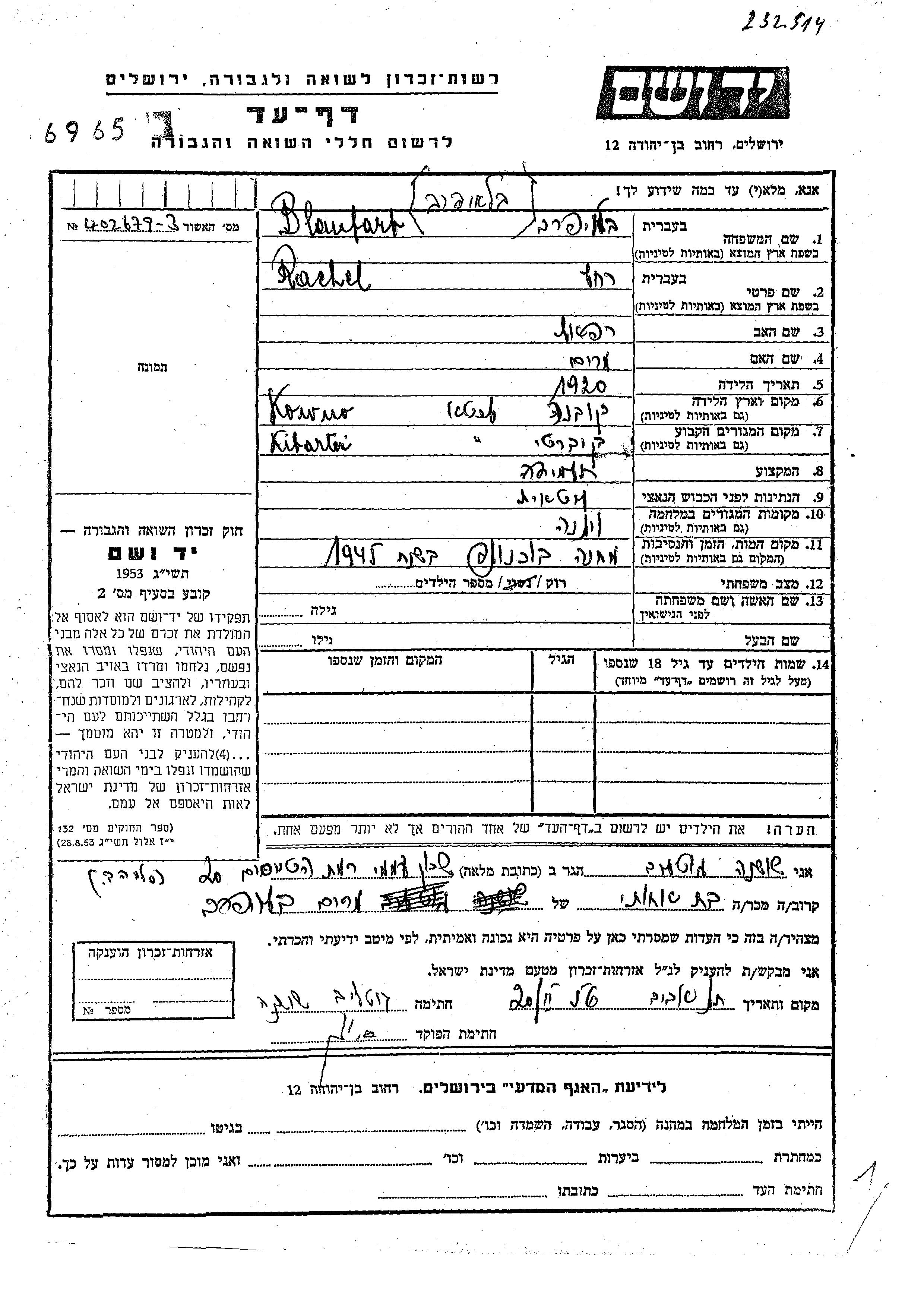 Rachel Blaufarb est née à Kowno, Lituanie en 1920, fille de Rafael et de Miriam. Elle était Élève et Célibataire. Avant la seconde guerre mondiale elle vivait à Kibart, Lituanie. Pendant la guerre, elle était à Vilna, Pologne.