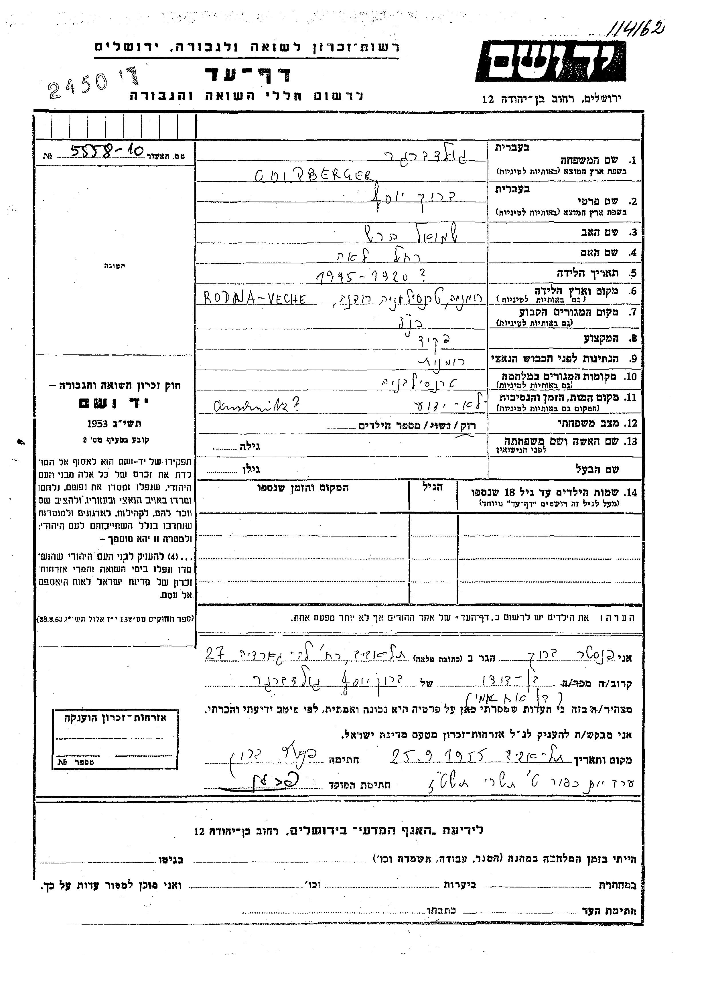 Barukh Yosef Goldberger est né à Rodna Veche, Roumanie en 1920, fils de Shmuel Beresh et de Rakhel Lea. Il était Employé/e de bureau. Avant la seconde guerre mondiale il vivait à Rodna Veche, Roumanie. Au cours de la guerre, il était à Transylvania, Roumanie.