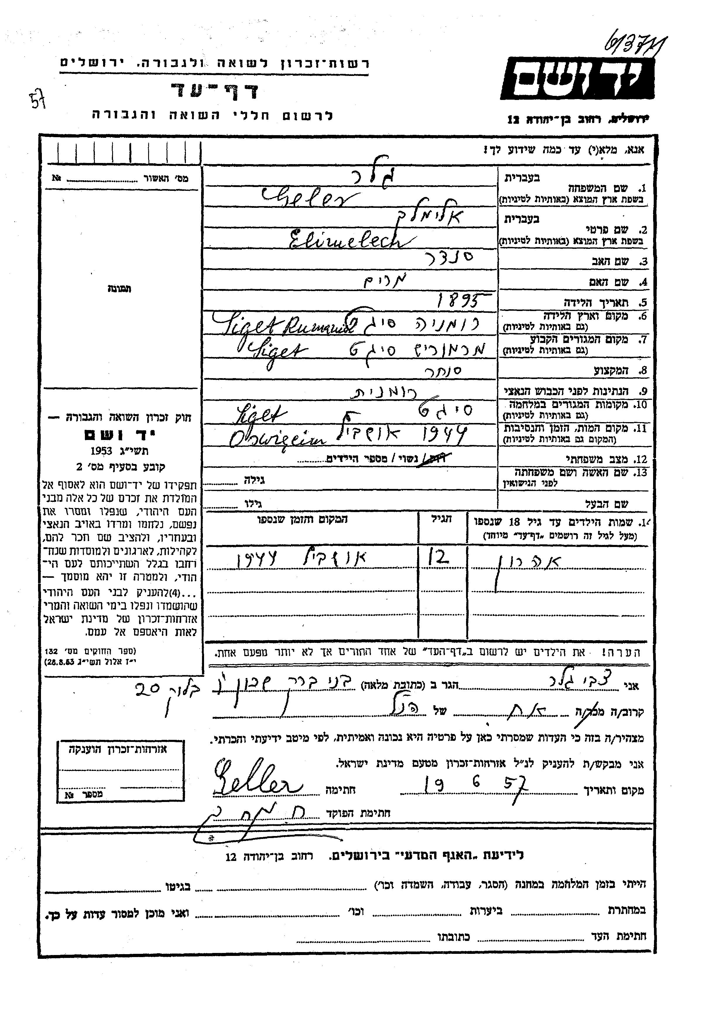 Elimelech a été assassiné pendant la Shoah. Lieu de la mort: Auschwitz, Pologne en 1944.