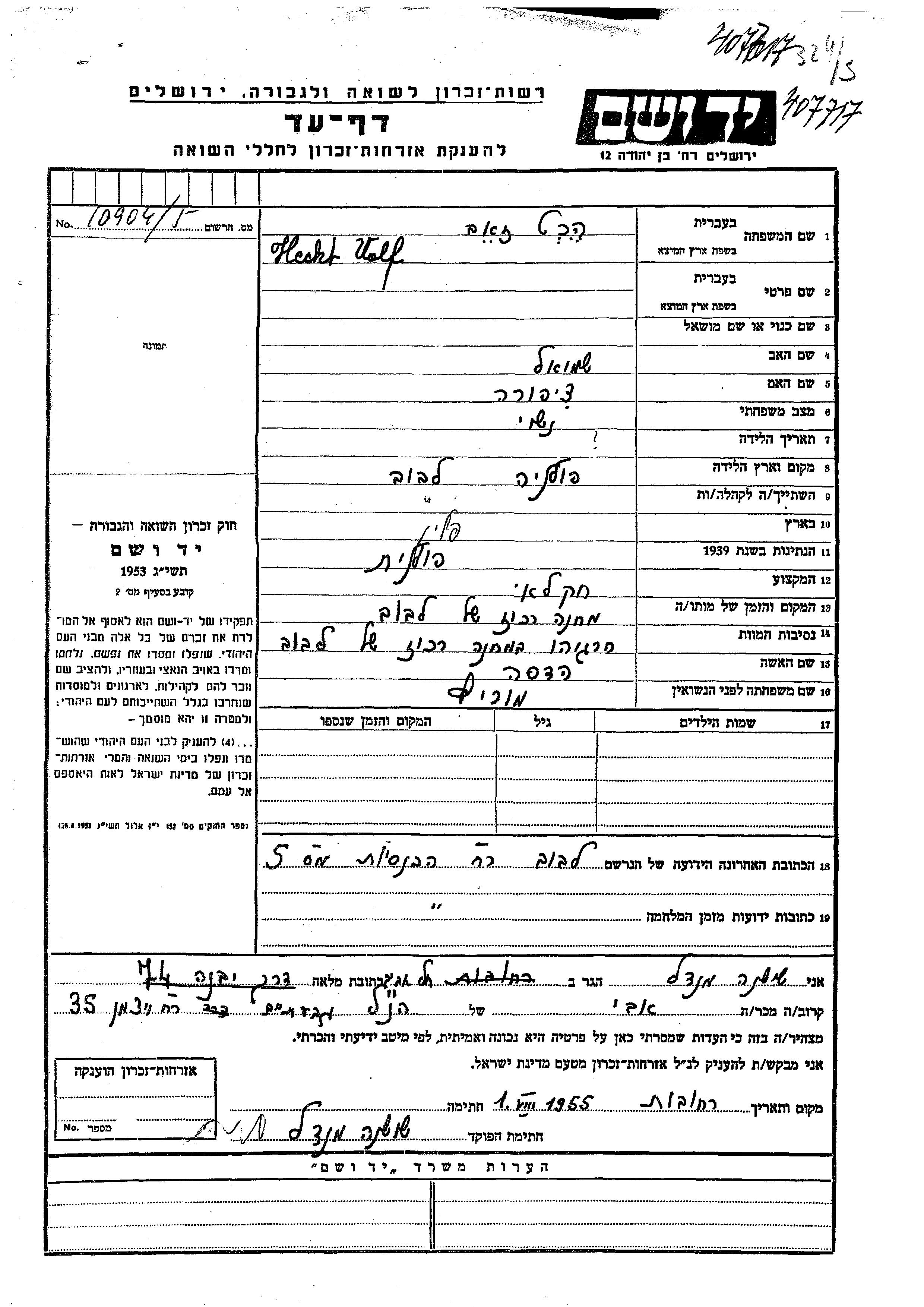Hecht Wolf Zeev Lwow, Pologne Feuille de témoignage