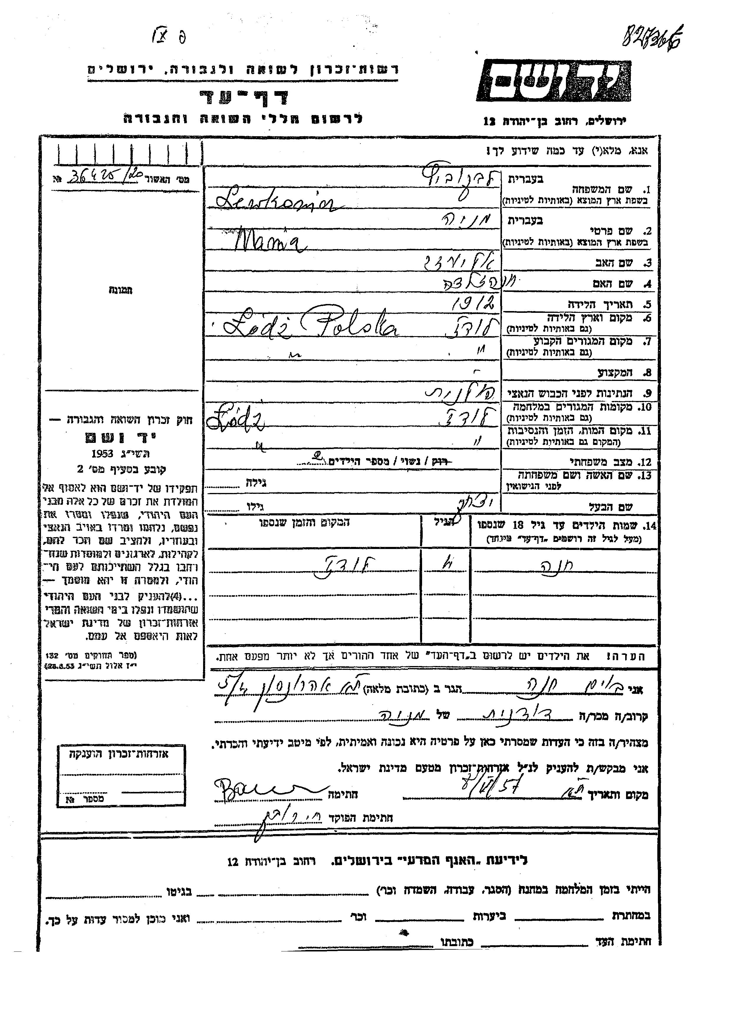 Lewkowicz Mania 1912 Lodz, Pologne Feuille de témoignage