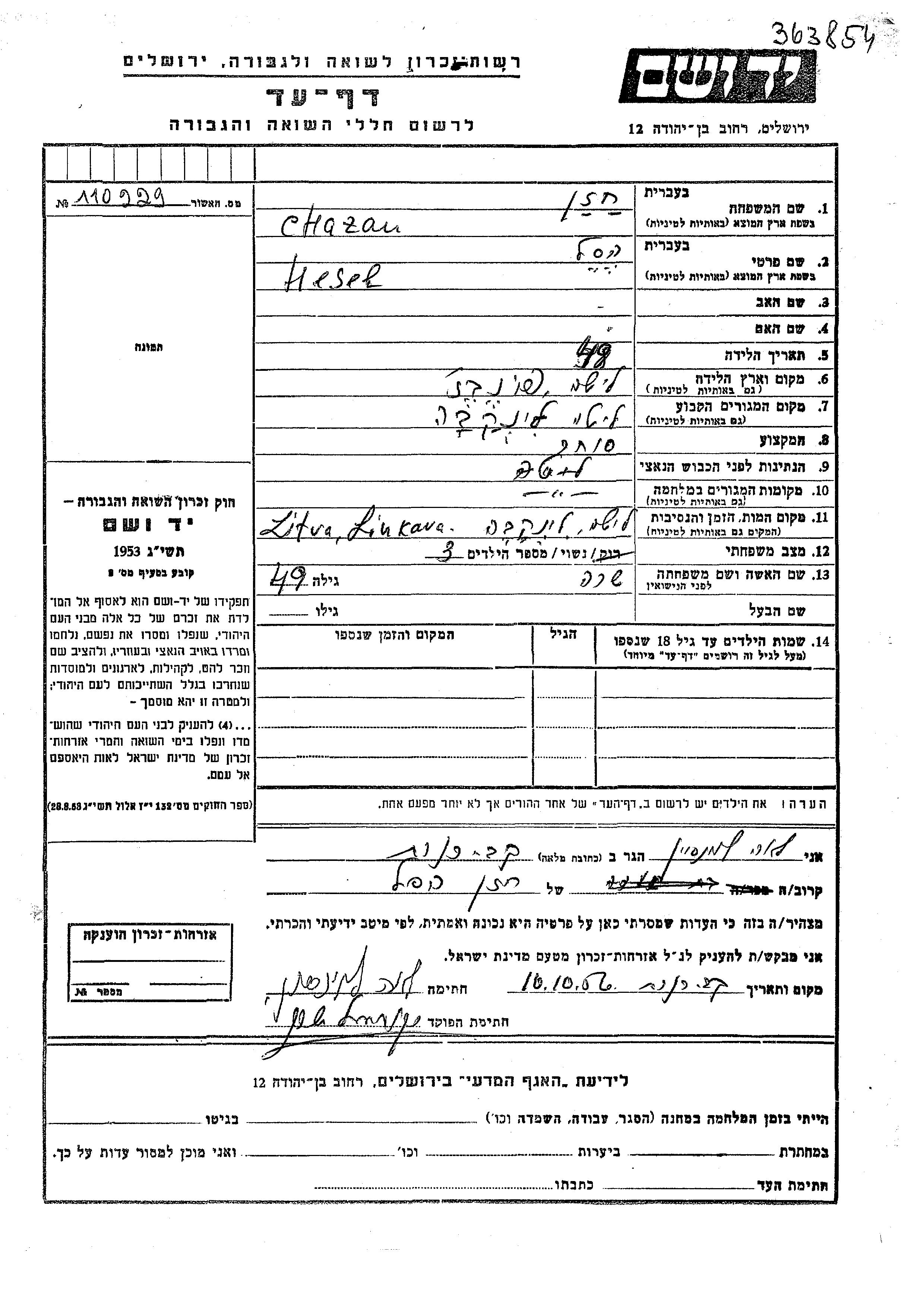 Chazan Hesel Linkova, Lituanie Feuille de témoignage
