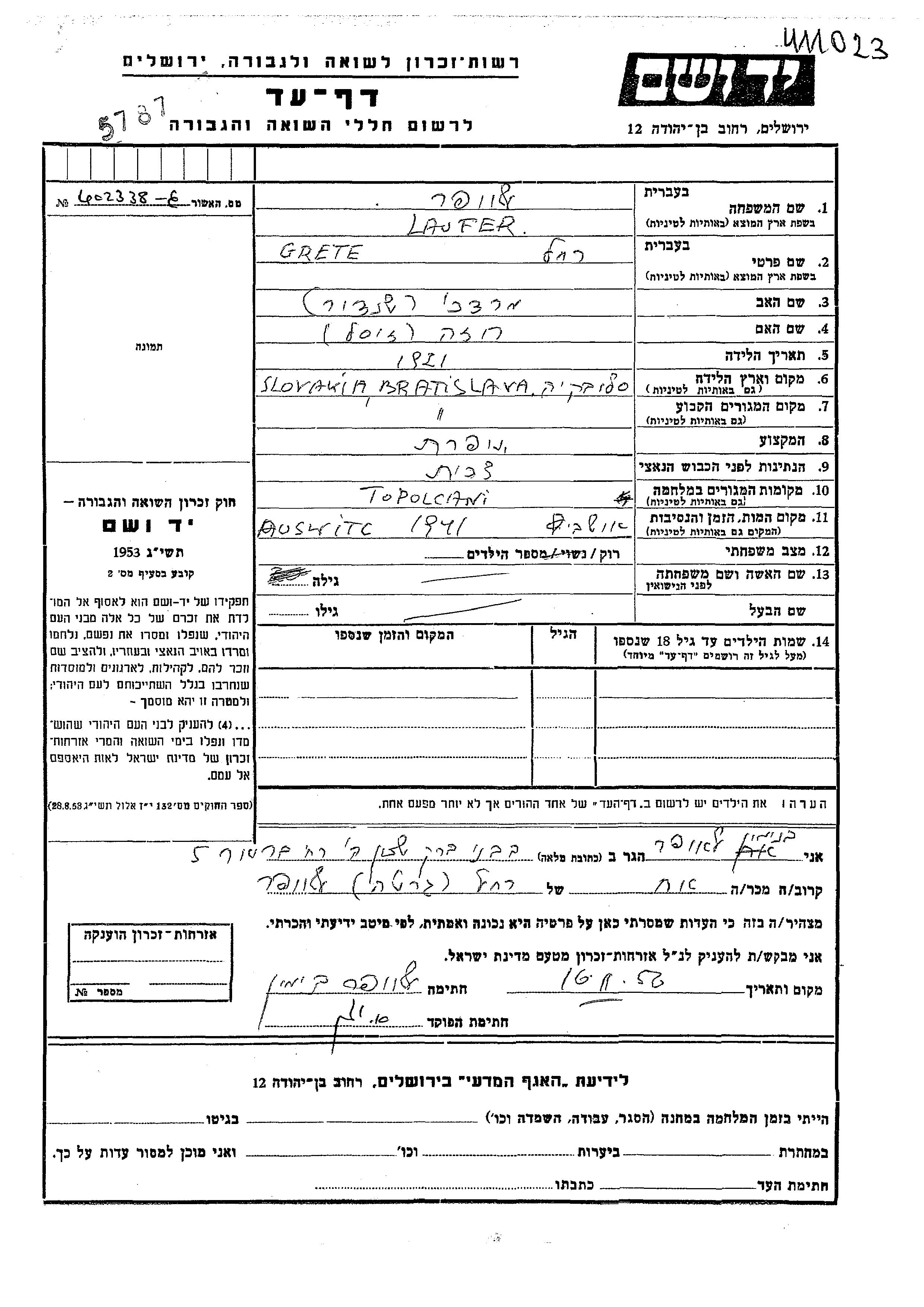 Laufer Grete Rakhel 1921 Bratislava, Tchécoslovaquie Feuille de témoignage