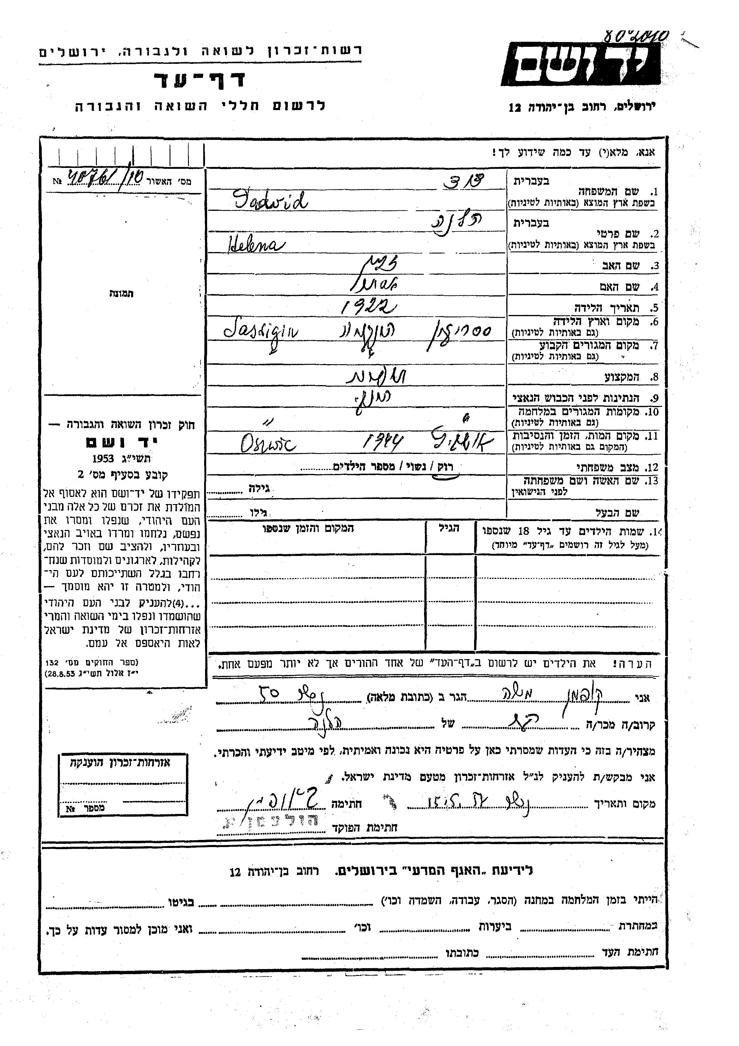 David Helena 1922 Sasrigin, Roumanie Feuille de témoignage