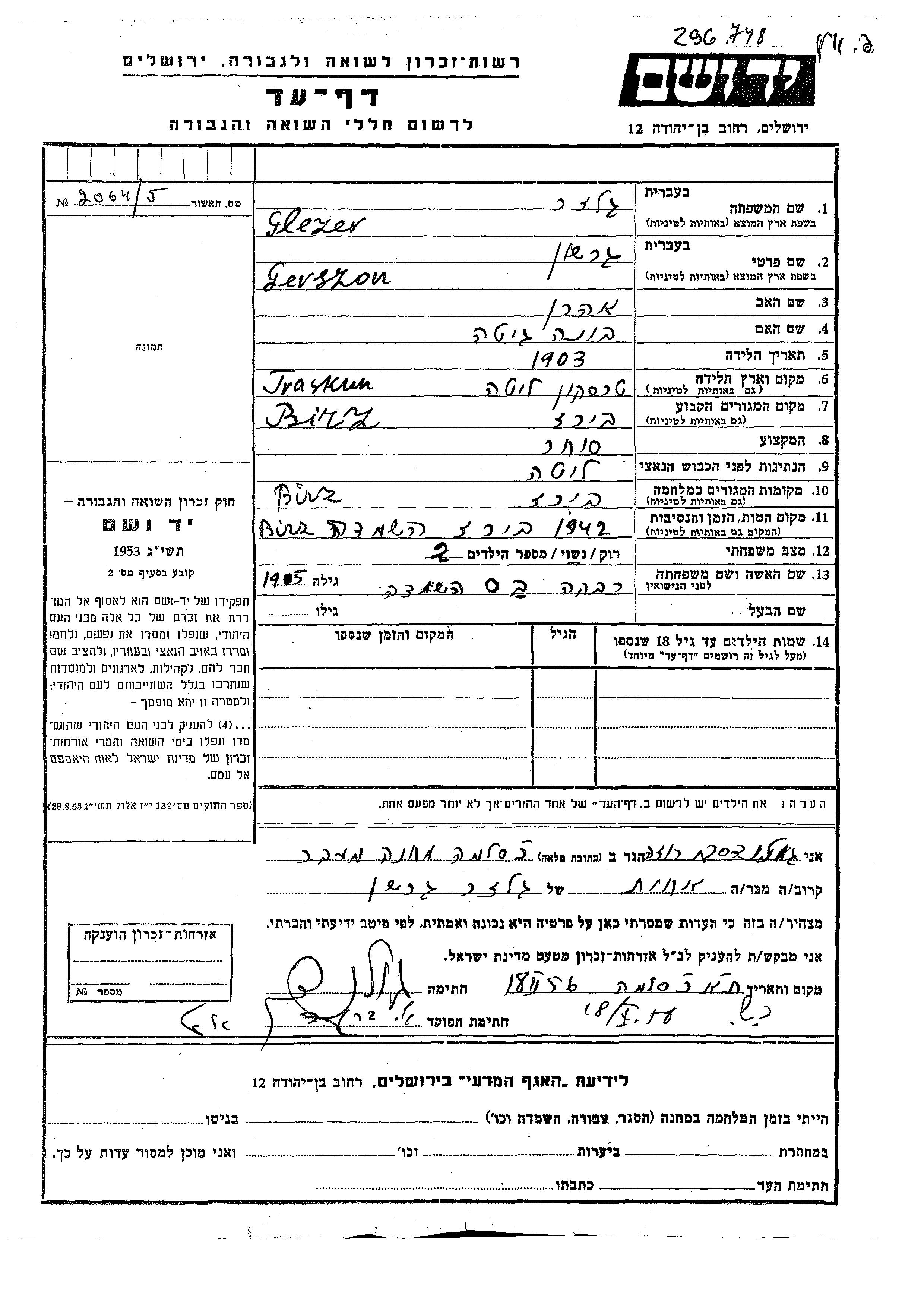 Glezer Gerszon 1903 Birze, Lituanie Feuille de témoignage