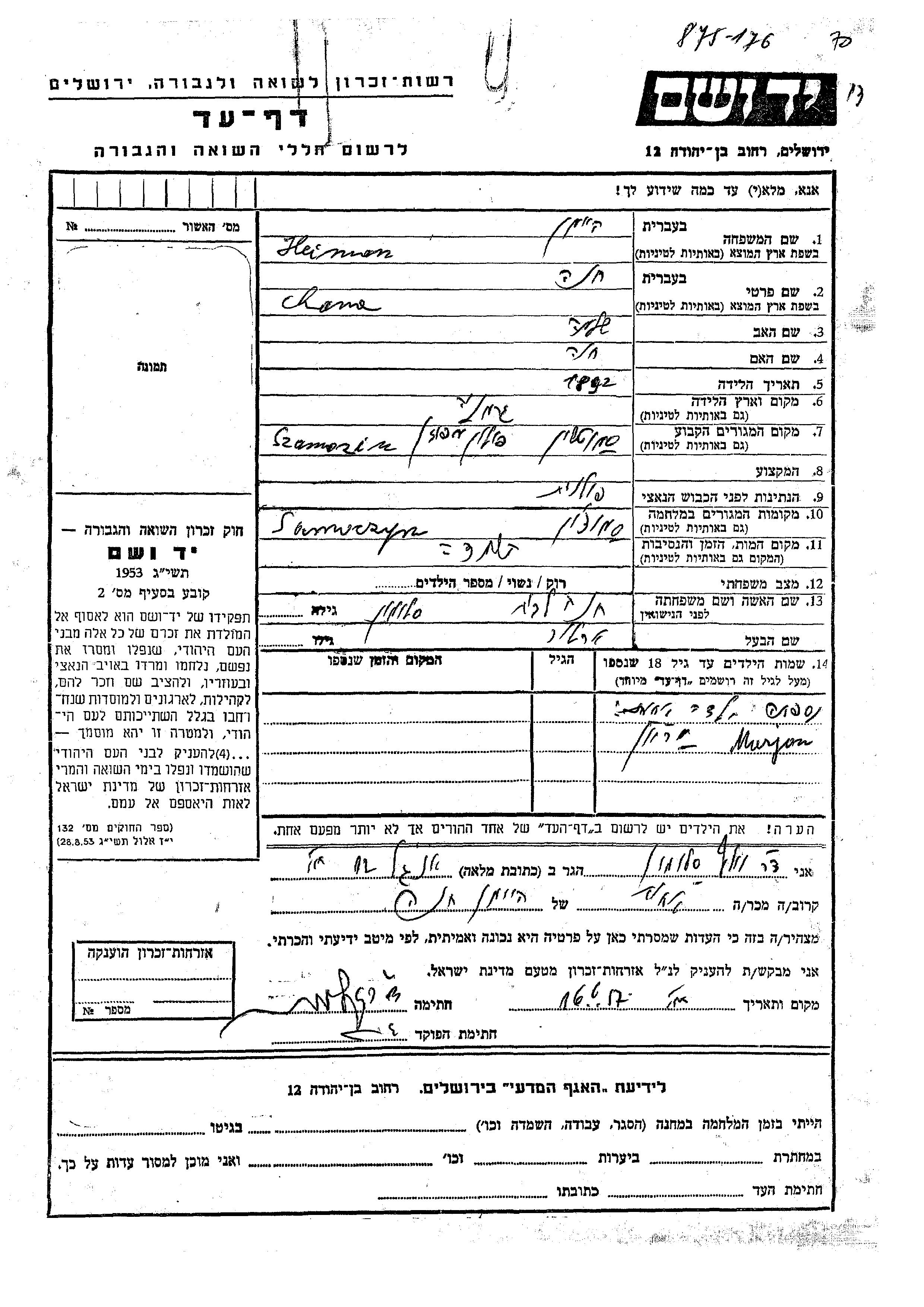 Heiman Chana 1892 Szamocin, Pologne Feuille de témoignage