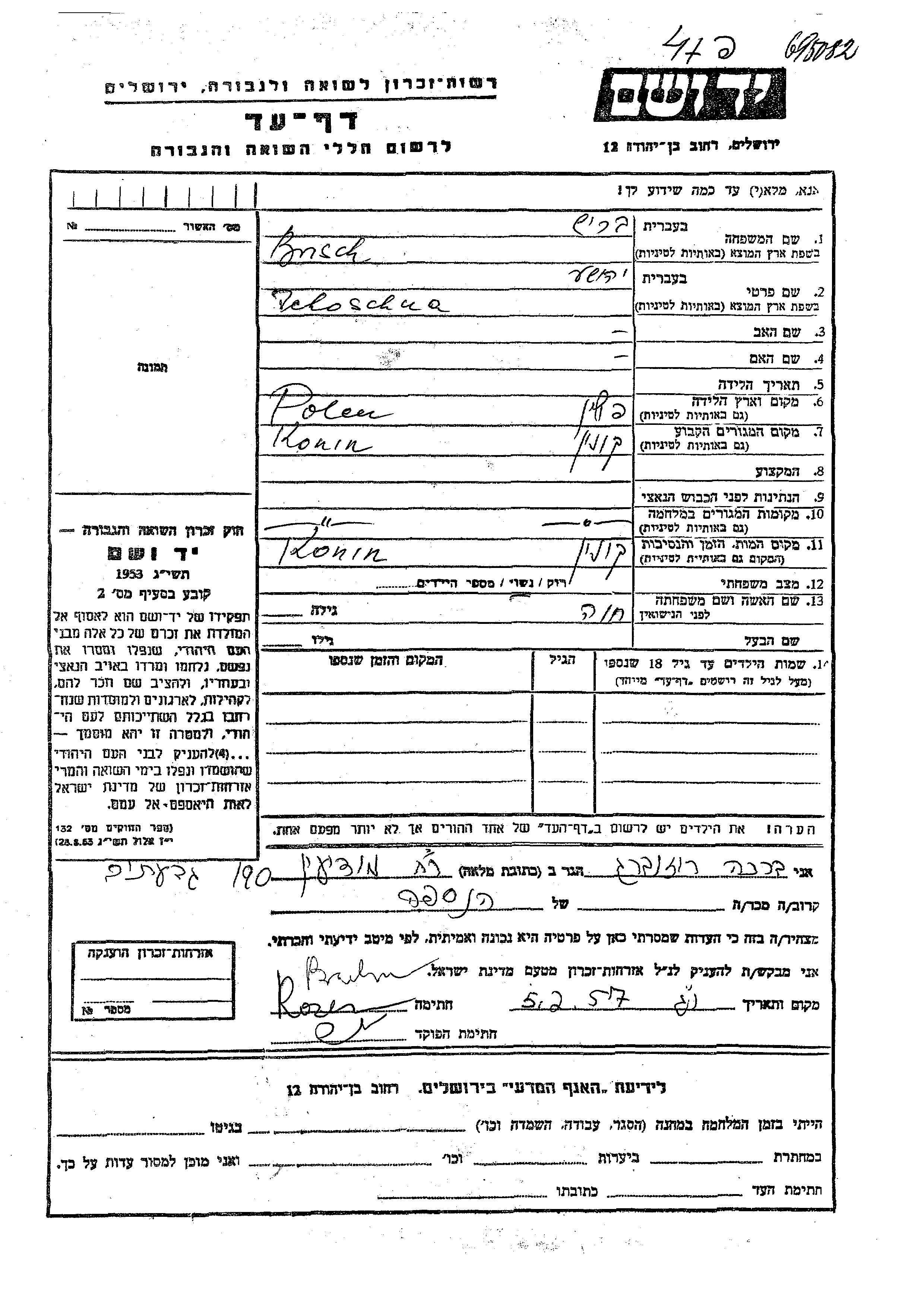 Brisch Berish Jehoschua Konin, Pologne Feuille de témoignage