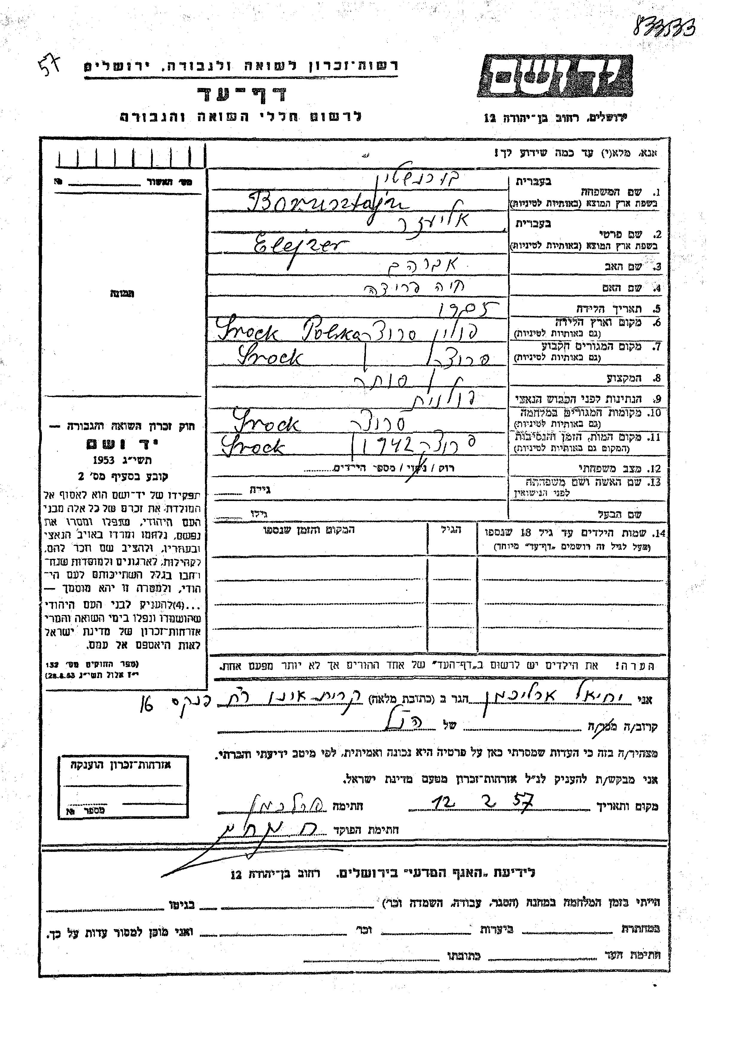 Bornsztajn Elejzer 1905 Serock, Pologne Feuille de témoignage