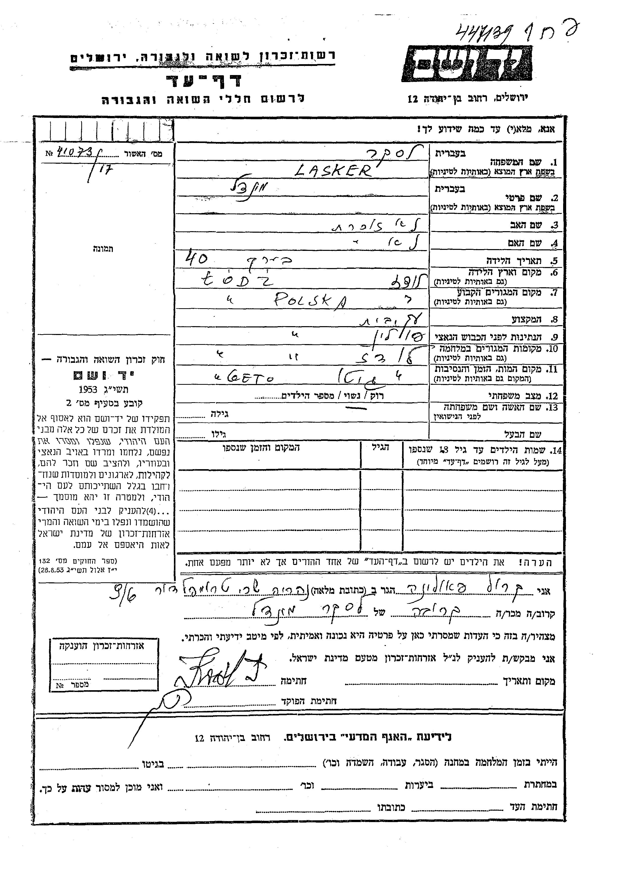 Lasker Mindl Lodz, Pologne Feuille de témoignage