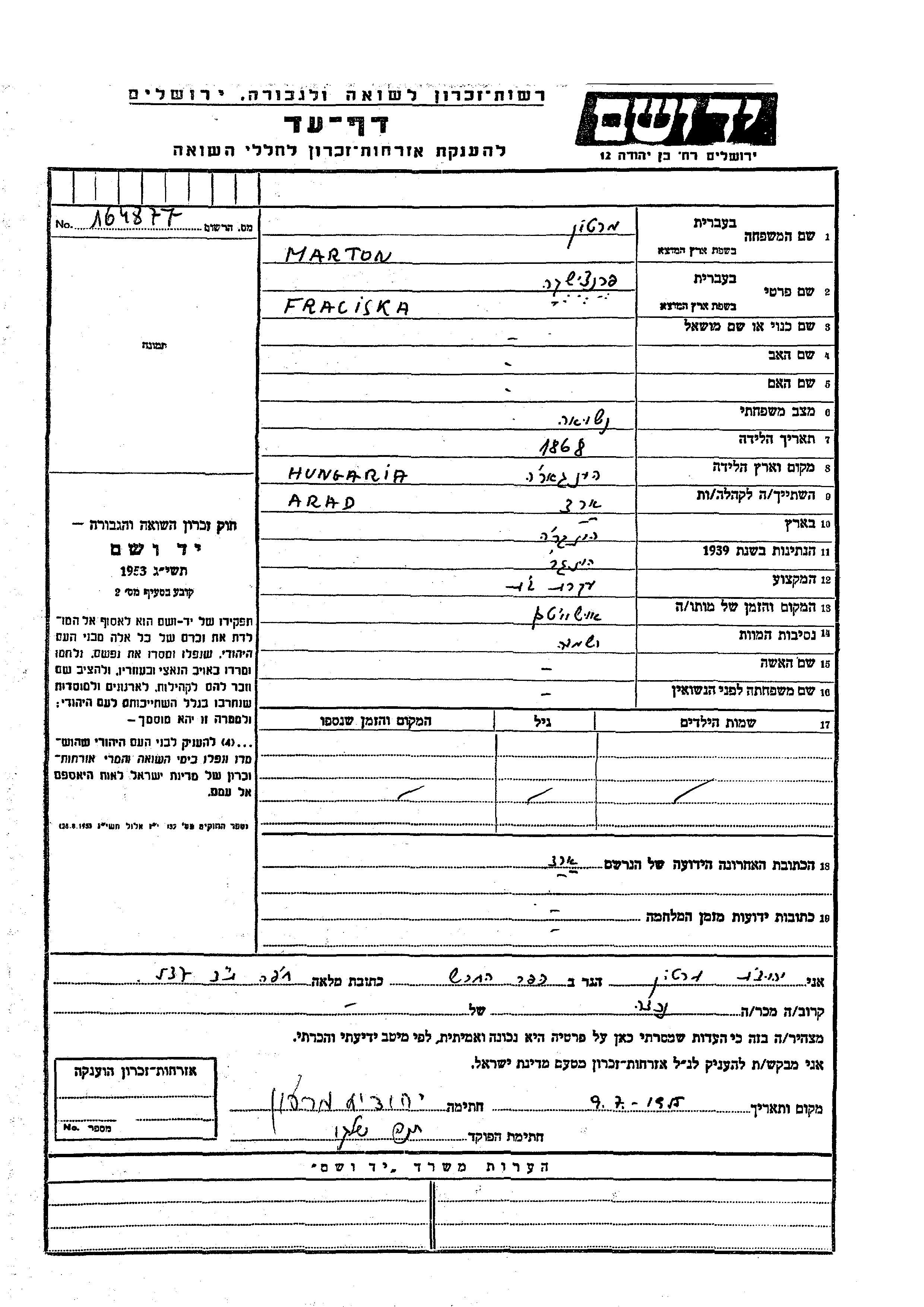 Fraciska Marton est née à Hongrie en 1868. Elle était Femme au foyer et Mariée. Avant la seconde guerre mondiale elle vivait à Arad, Roumanie.