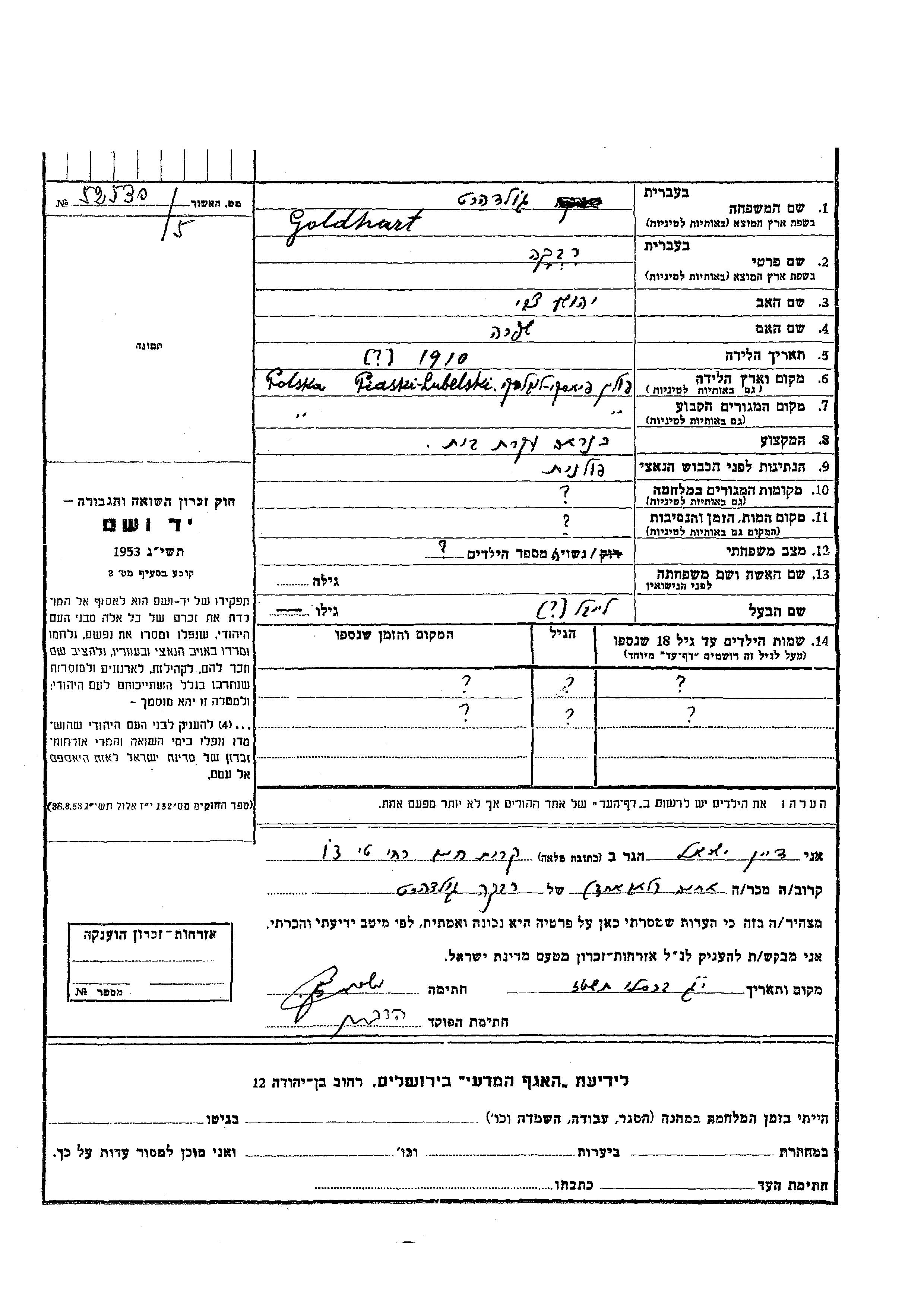 Goldhart Rivka 1910 Piaski, Pologne Feuille de témoignage